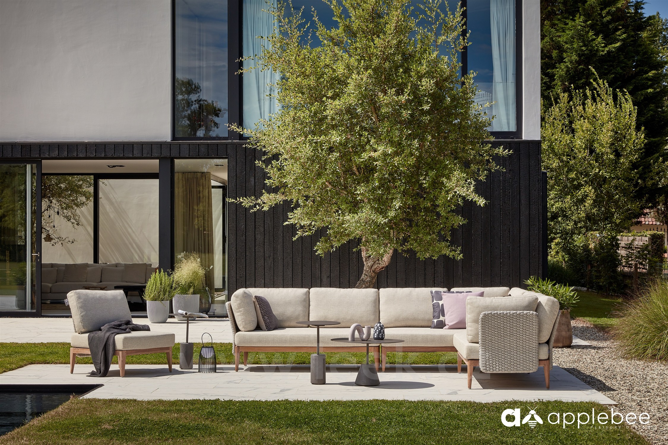 Venkovní modulová sedací sestava z přírodního teaku s lankovým výpletem od značky Apple Bee. Díky flexibilním opěrkám lze z dílů vytvořit nekonečně mnoho kombinací.