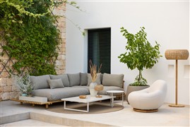 Křeslo je plně čalouněné s otočnou základnou z teakového dřeva.