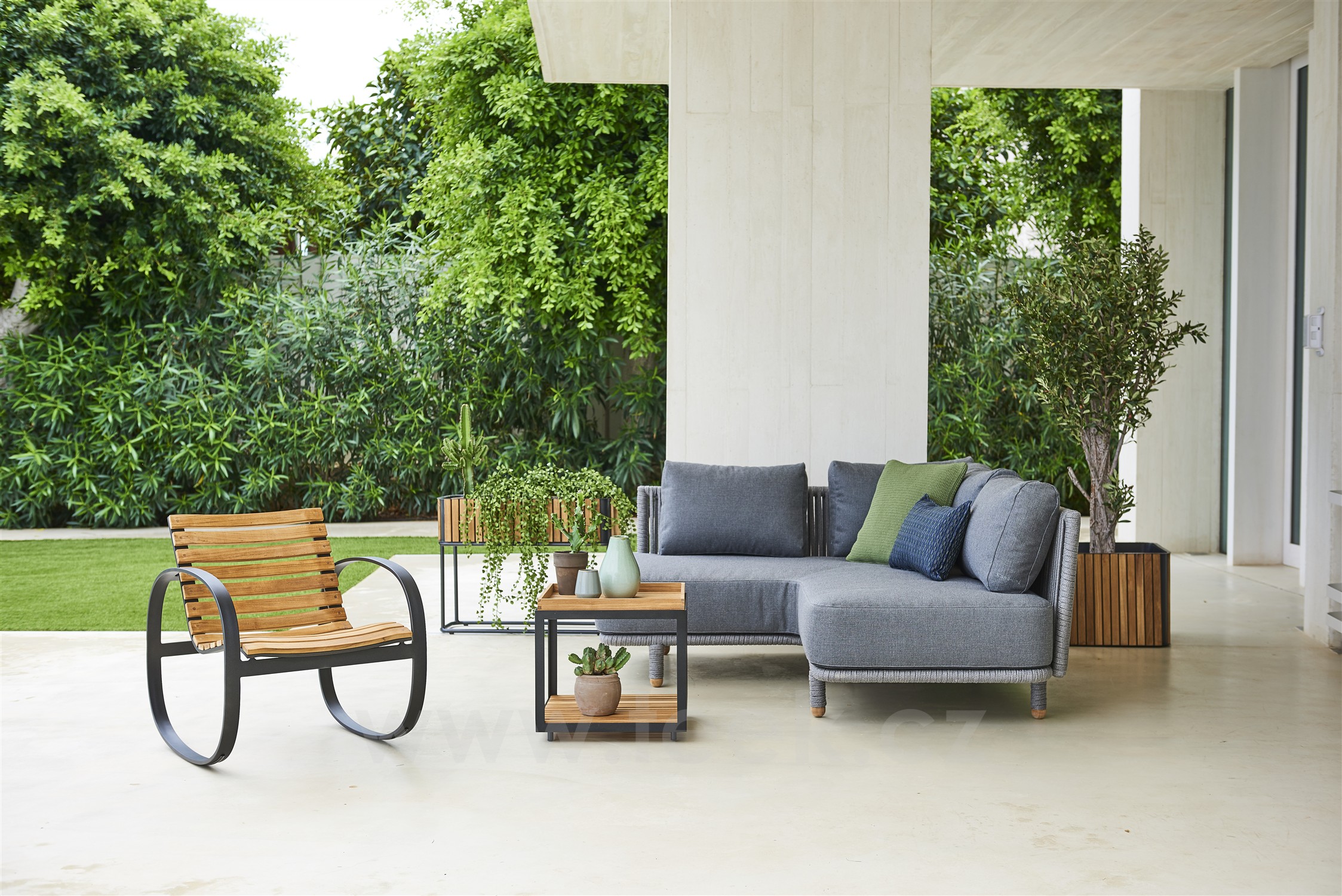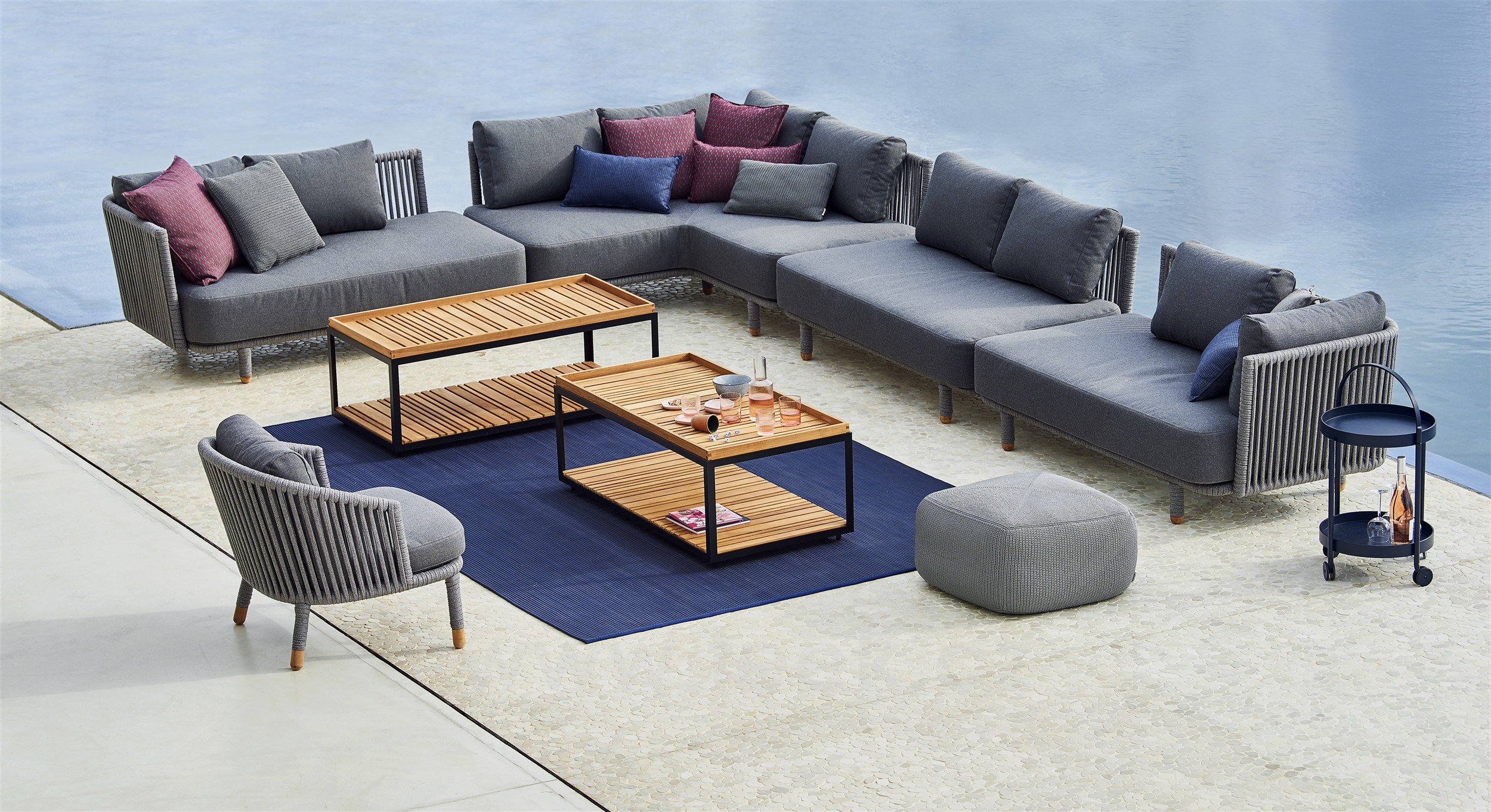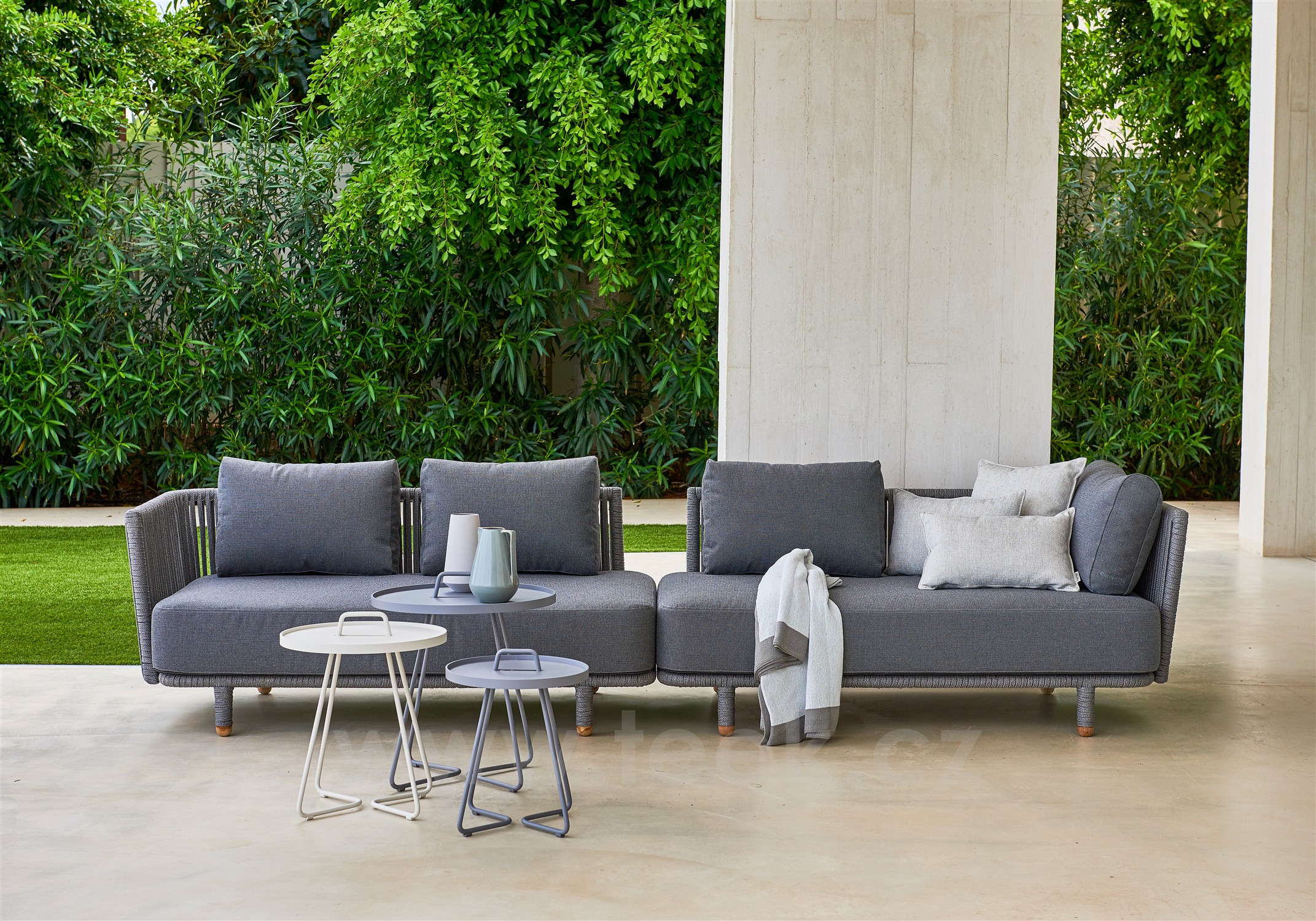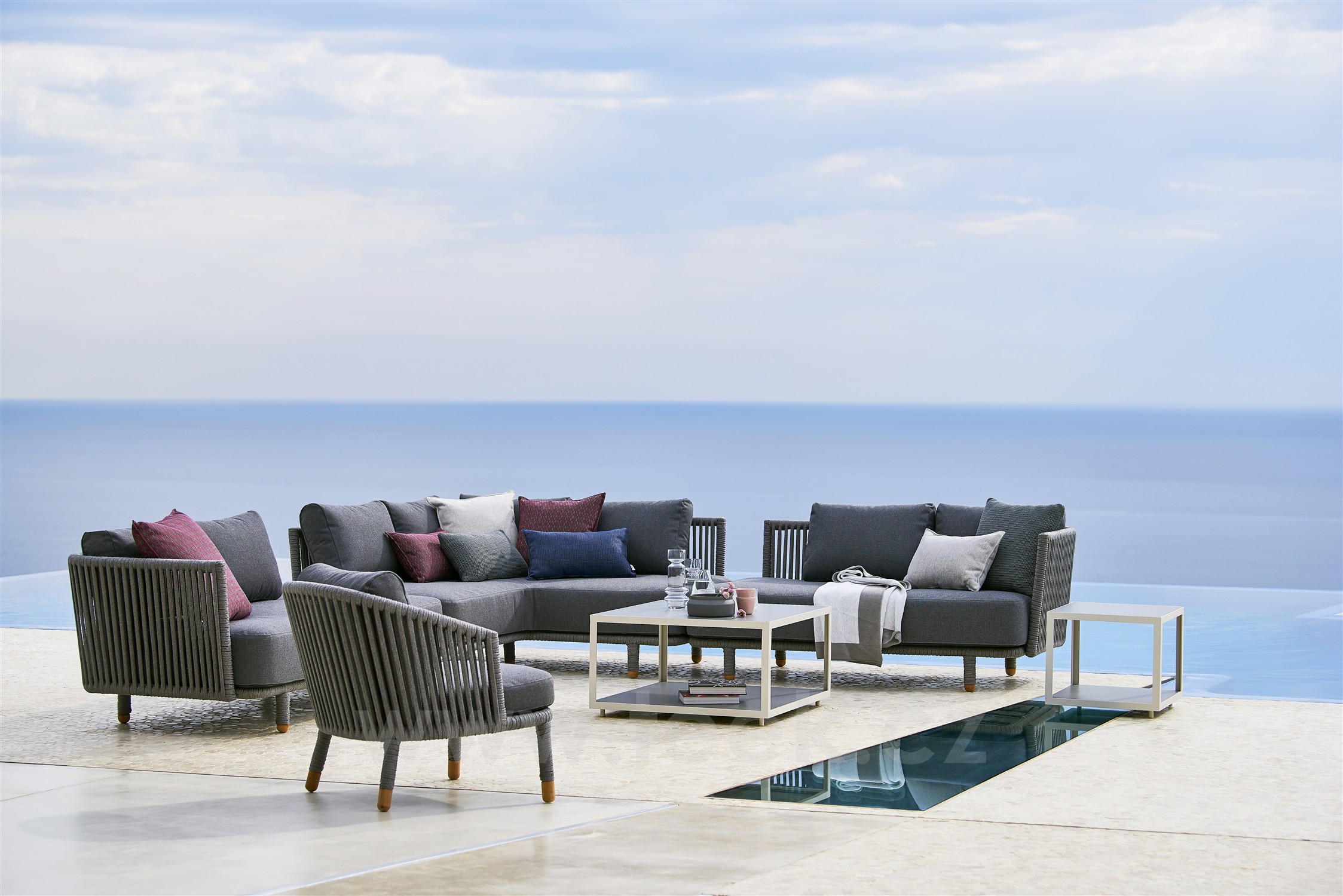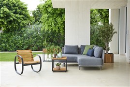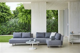 Oblíbená venkovní kolekce Moments Lounge od Cane -line. Kolekci lze kombinovat s jídelním venkovním nábytkem