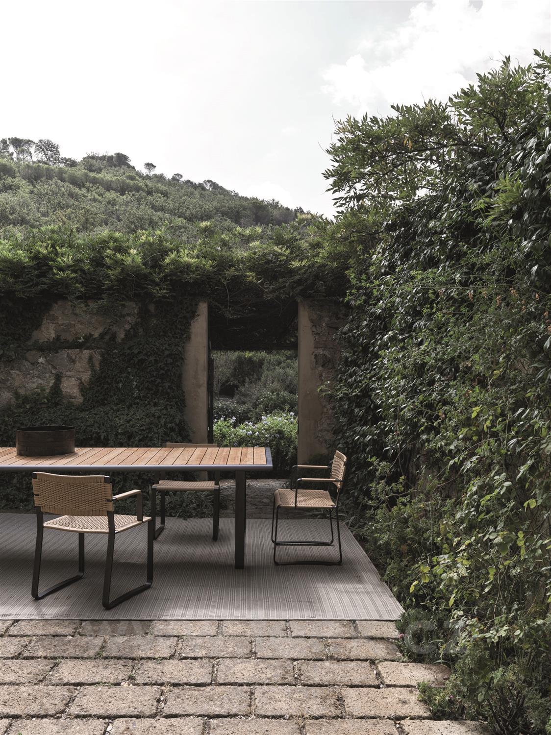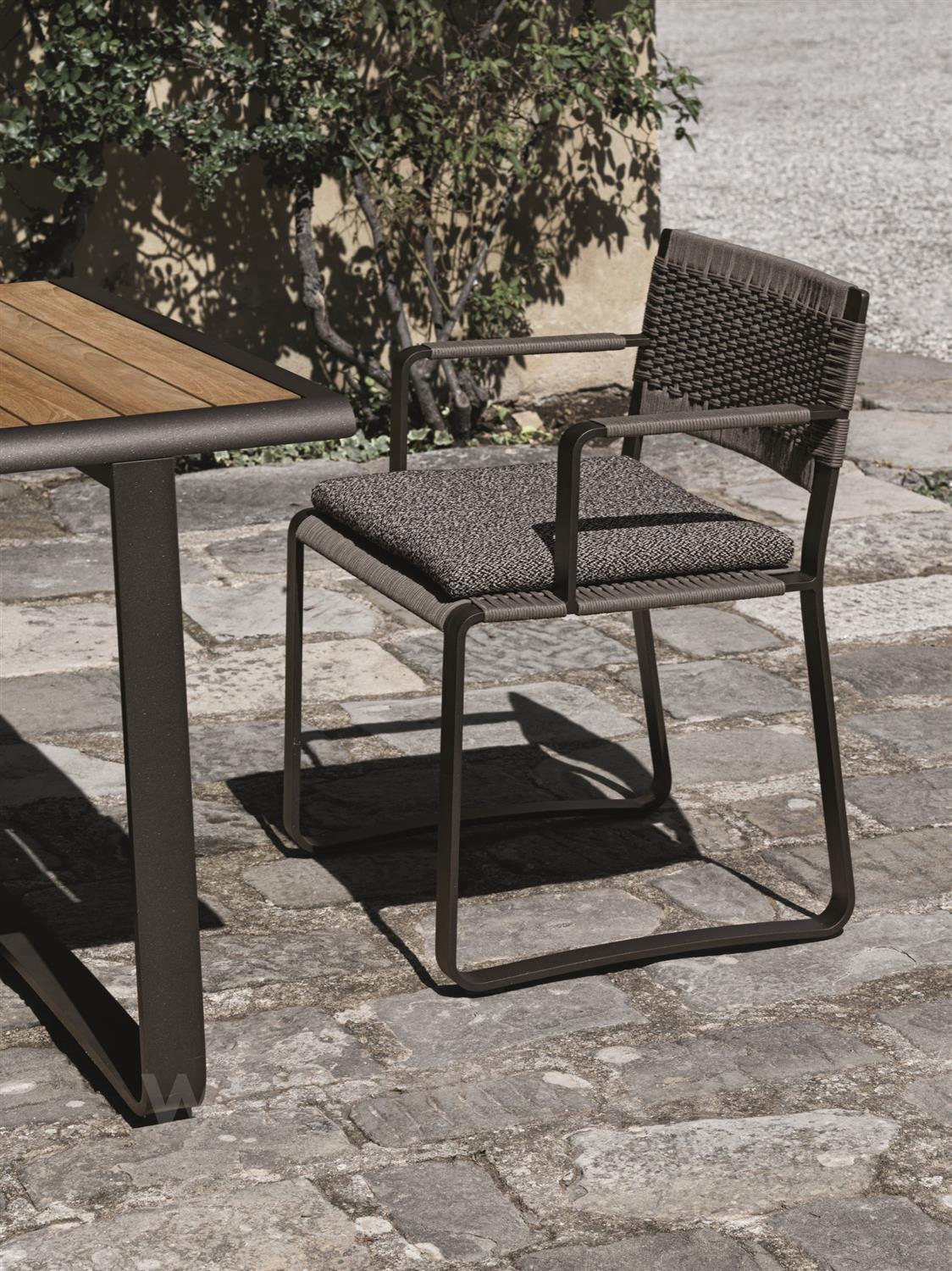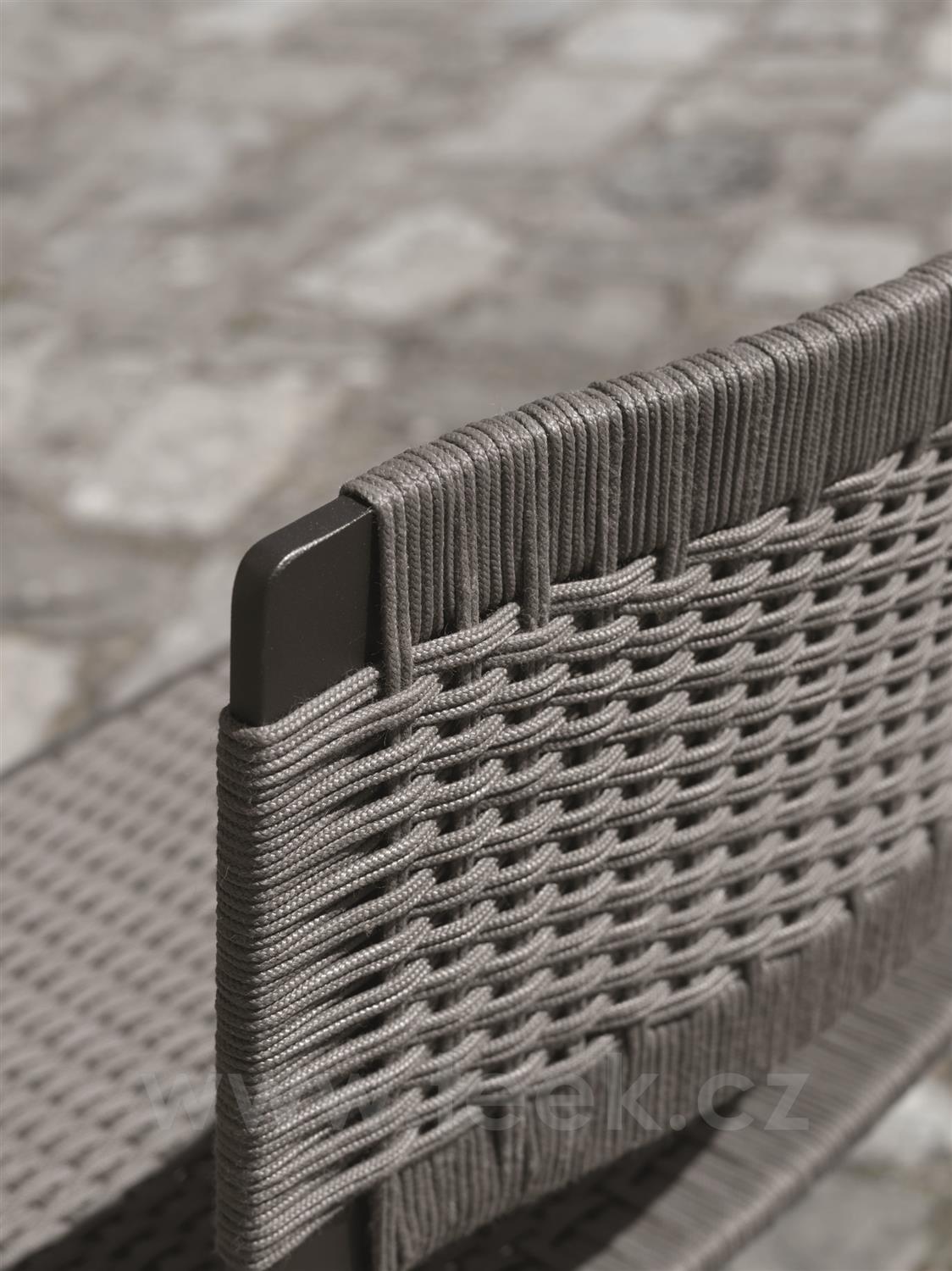 Elegantní venkovní sedací nábytek s lehkou hliníkovou konstrukcí a ručně tkaným polypropylenovým potahem. Kompaktní rozměry, vzdušný design a tradiční tkaný vzor zajišťují komfort a flexibilitu pro jakýkoli venkovní prostor.