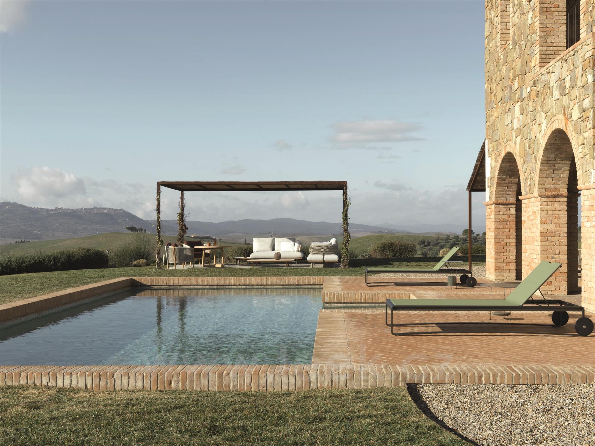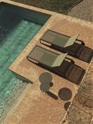 Guell lehátko z kolekce Timeout kombinuje lakovaný hliník a ručně tkané polypropylenové pásky s možností provedení z masivního teaku nebo nového Batyline materiálu. Nastavitelná opěrka a kolečko pro snadnou manipulaci zajišťují pohodlí i praktičnost, zatímco jemné proporční detaily odrážejí charakter celé kolekce.