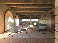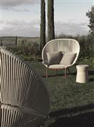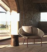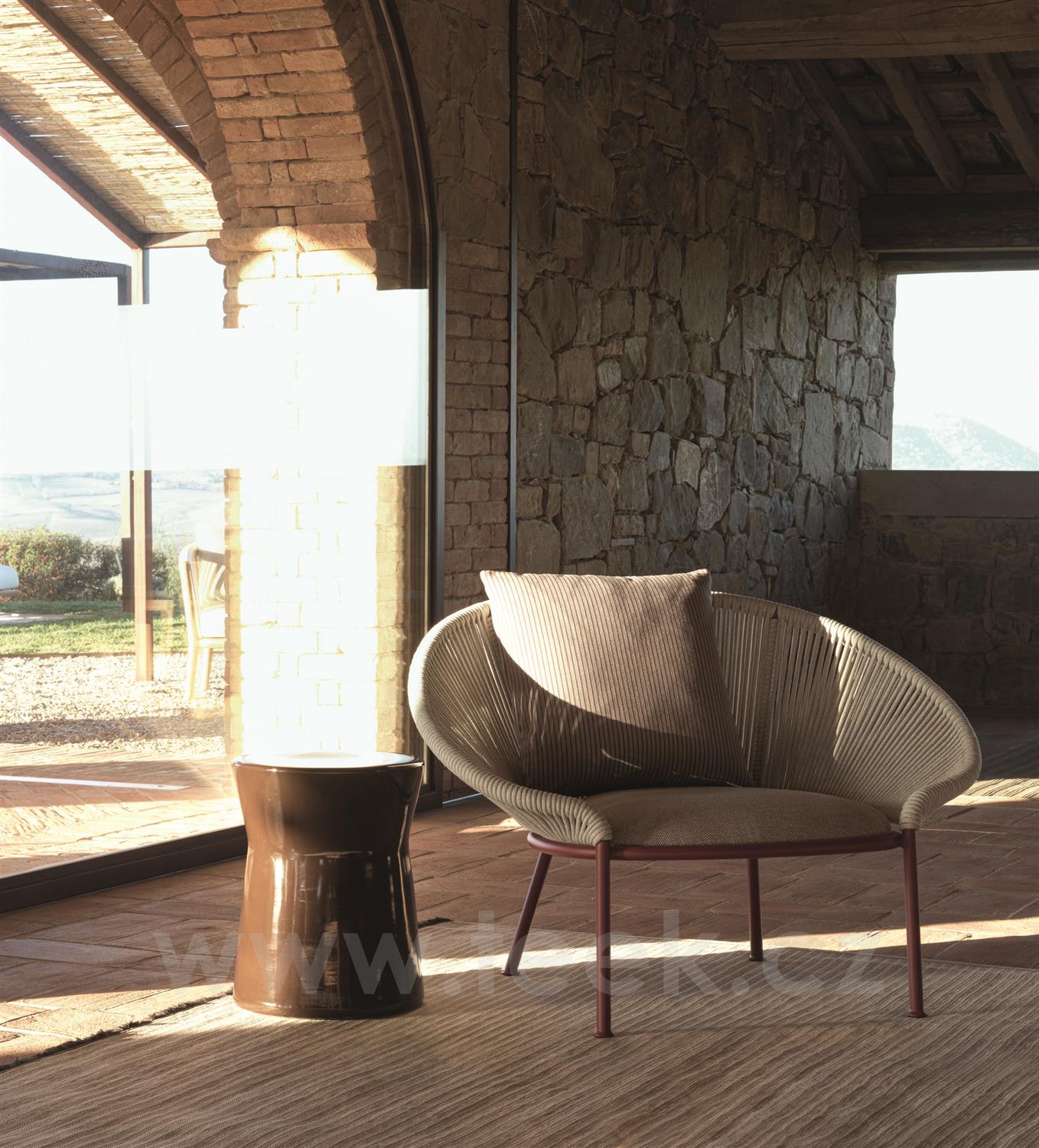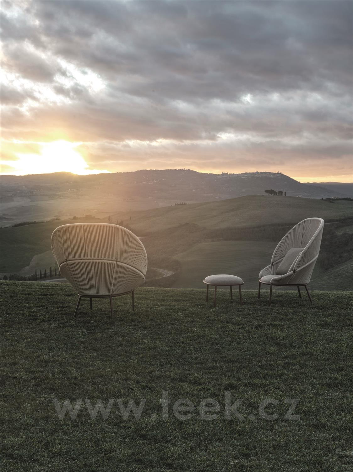 Elegantní venkovní křeslo s jemně zakřiveným opěradlem, vytvářejícím útulný prostor. Konstrukce z recyklovatelného hliníku v barvě merlot je kombinována s ručně tkanými polypropylenovými pásky odolnými vůči vodě a povětrnostním vlivům. Opěradlo je dostupné ve vysoké i nízké verzi a umožňuje různé kombinace pohodlí a dynamických uspořádání. Součástí je i pohodlný taburet, který doplňuje sedací soupravu, a polštáře přizpůsobitelné estetickým i ergonomickým požadavkům.