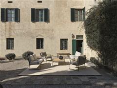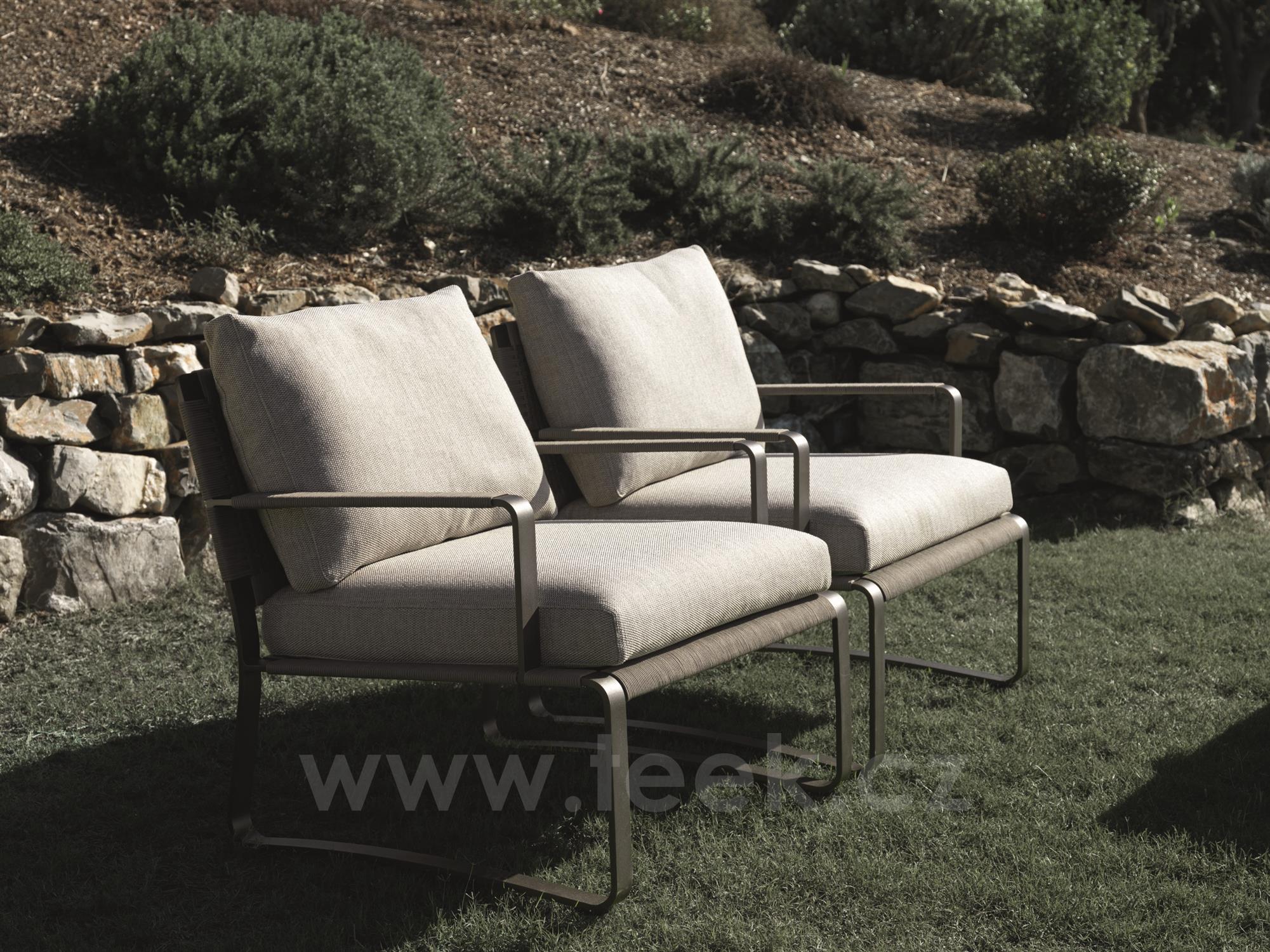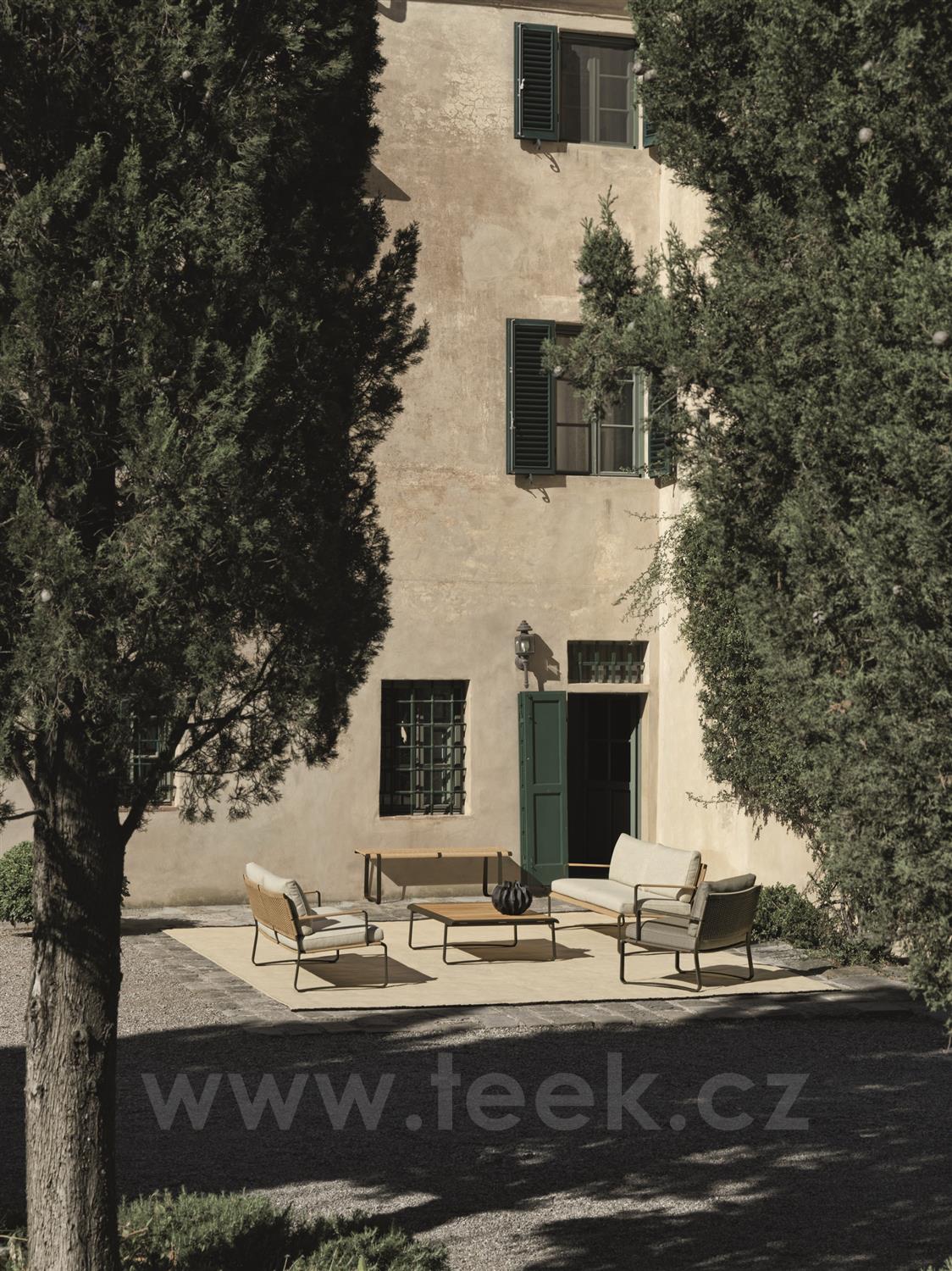 Elegantní venkovní nábytek s dvoumístnou pohovkou, prostorným křeslem a konferenčním stolkem. Lakovaná hliníková konstrukce s ručně tkaným polypropylenovým čalouněním kombinuje minimalistický design s komfortem a nadčasovou elegancí.