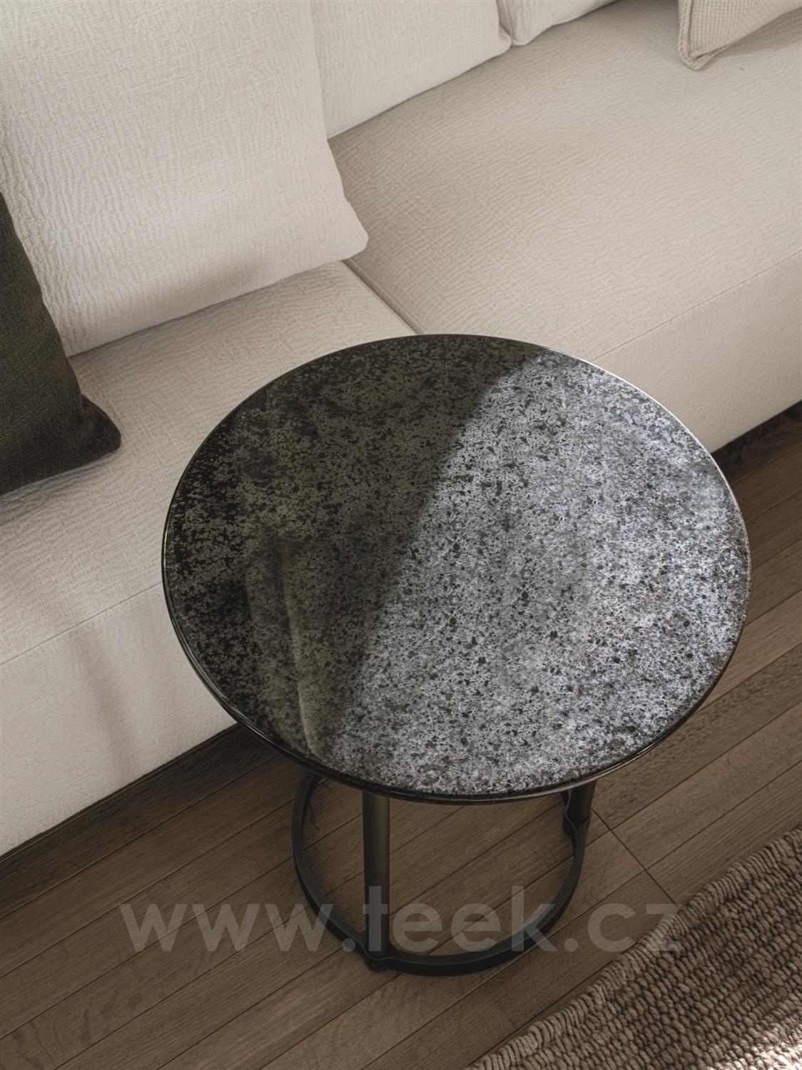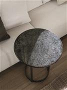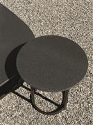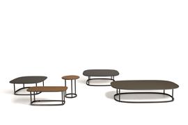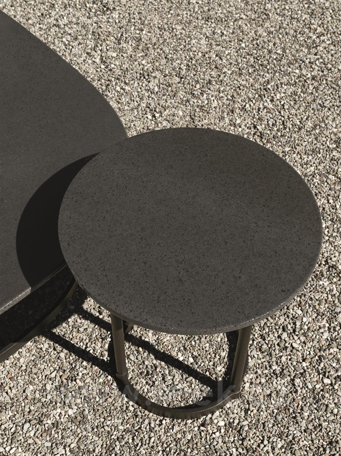 Kulaté a oválné stolky bez hran s kovovým rámem a deskou z lávového kamene Etna.