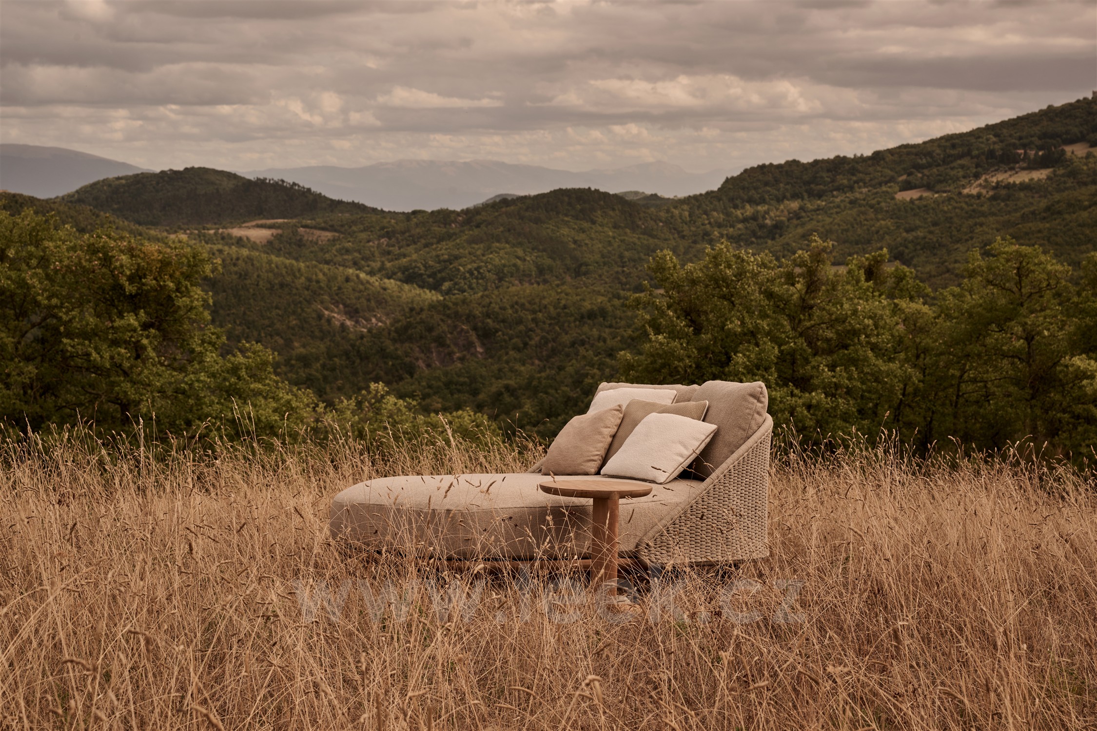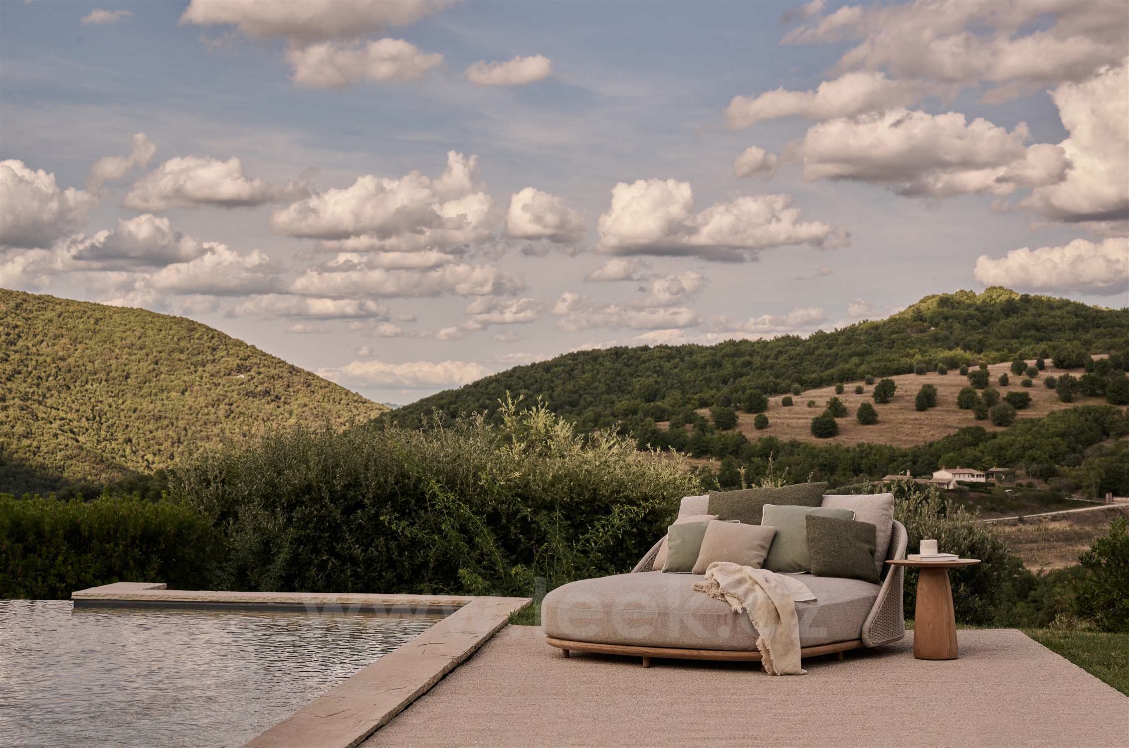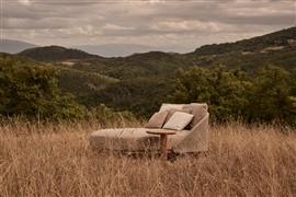 Venkovní postel Elio Sofa, Tribu, 177x165x69,5 cm, rám teak, výplet lanko linen, polstrování látka kat.E