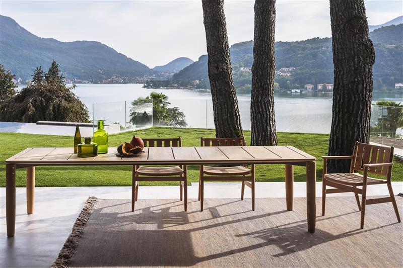 Ucelená jídelní kolekce venkovního nábytku od Piera Lissoni. Jídelní křeslo a jídelní stoly v mnoha rozměrech, včetně jedinečných velkých kulatých stolů pro až 8 osob.