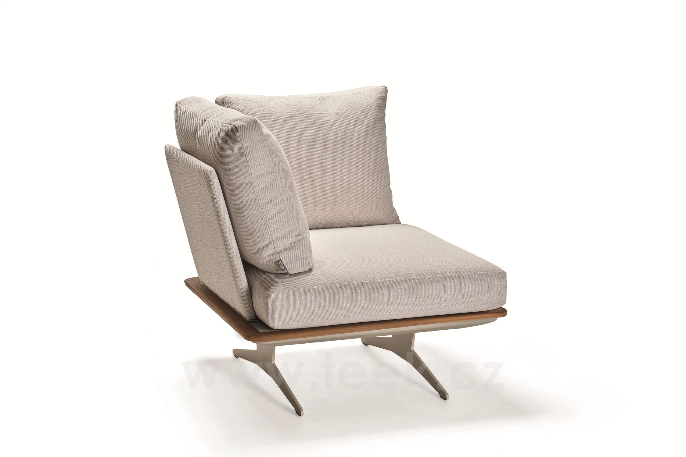 Rám: lakovaný hliník a teakové dřevo. Rozměr: 95x95x85 cm.