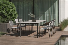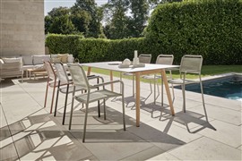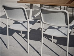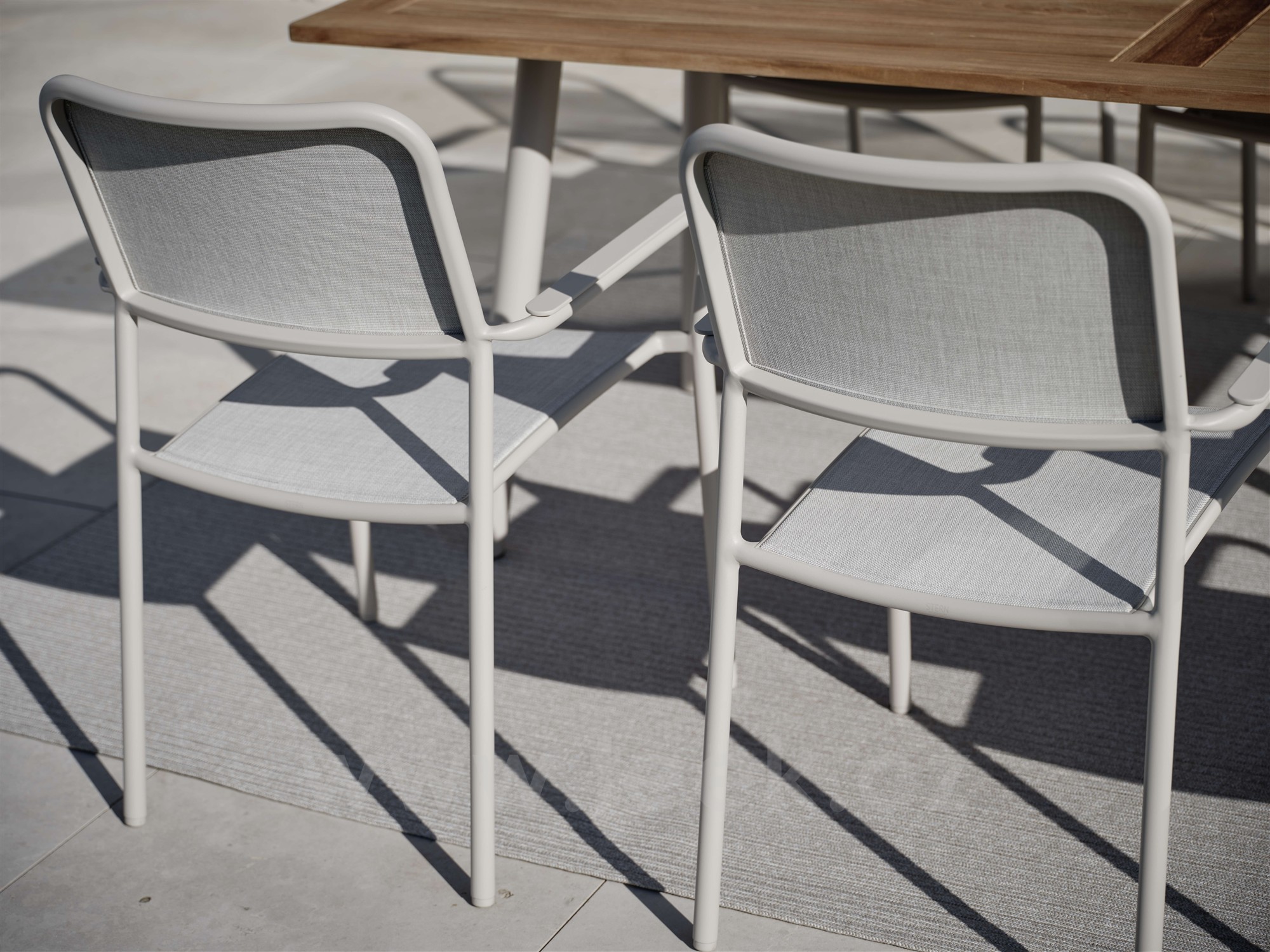Venkovní hliníková jídelní stohovatelná křesla v různých barvách. Výplet je z pohodlného a pružného textilenu nebo atraktivních venkovních lanek. Křeslům lze přidat teakové područky za příplatek.