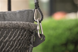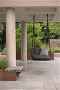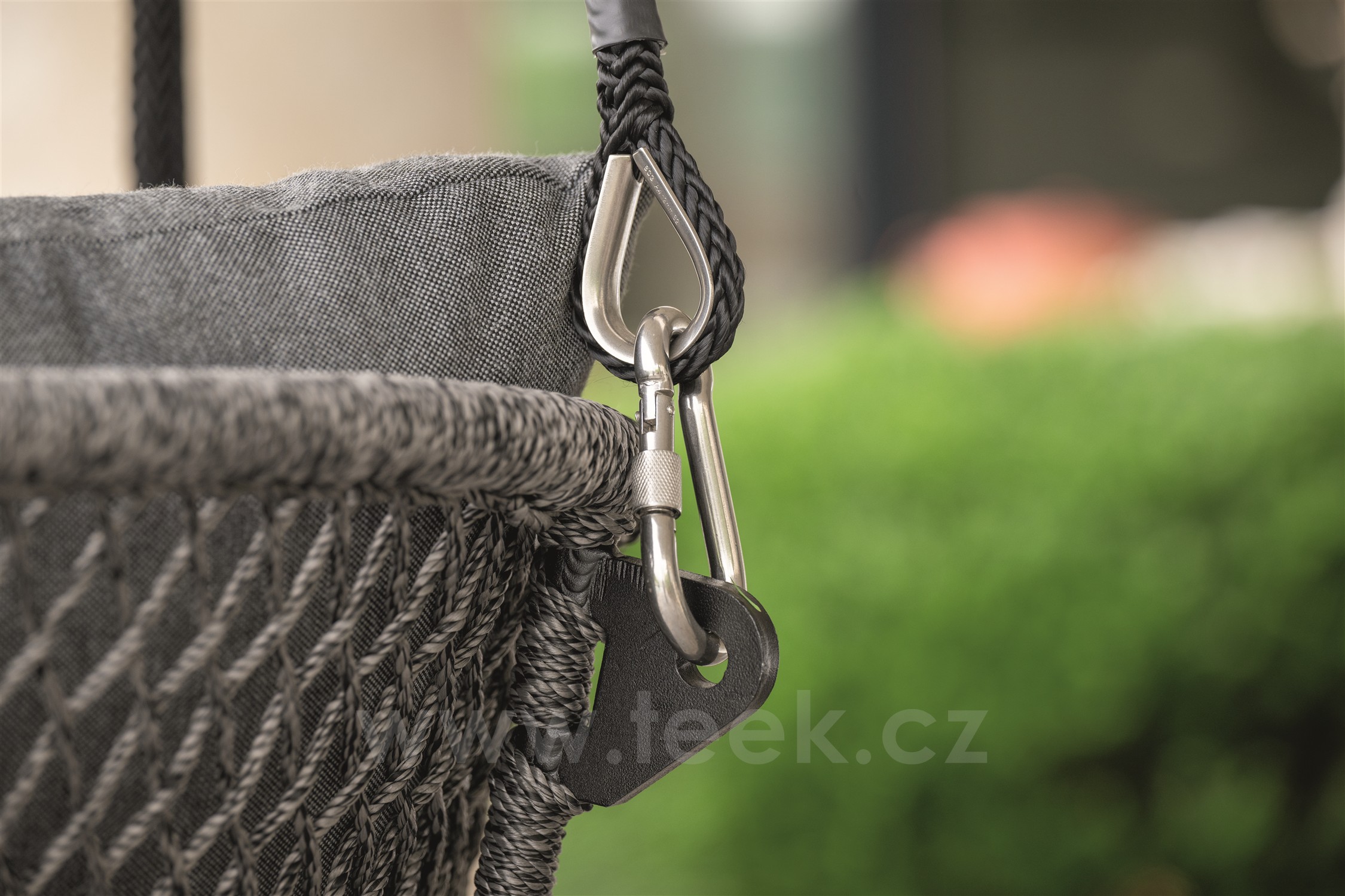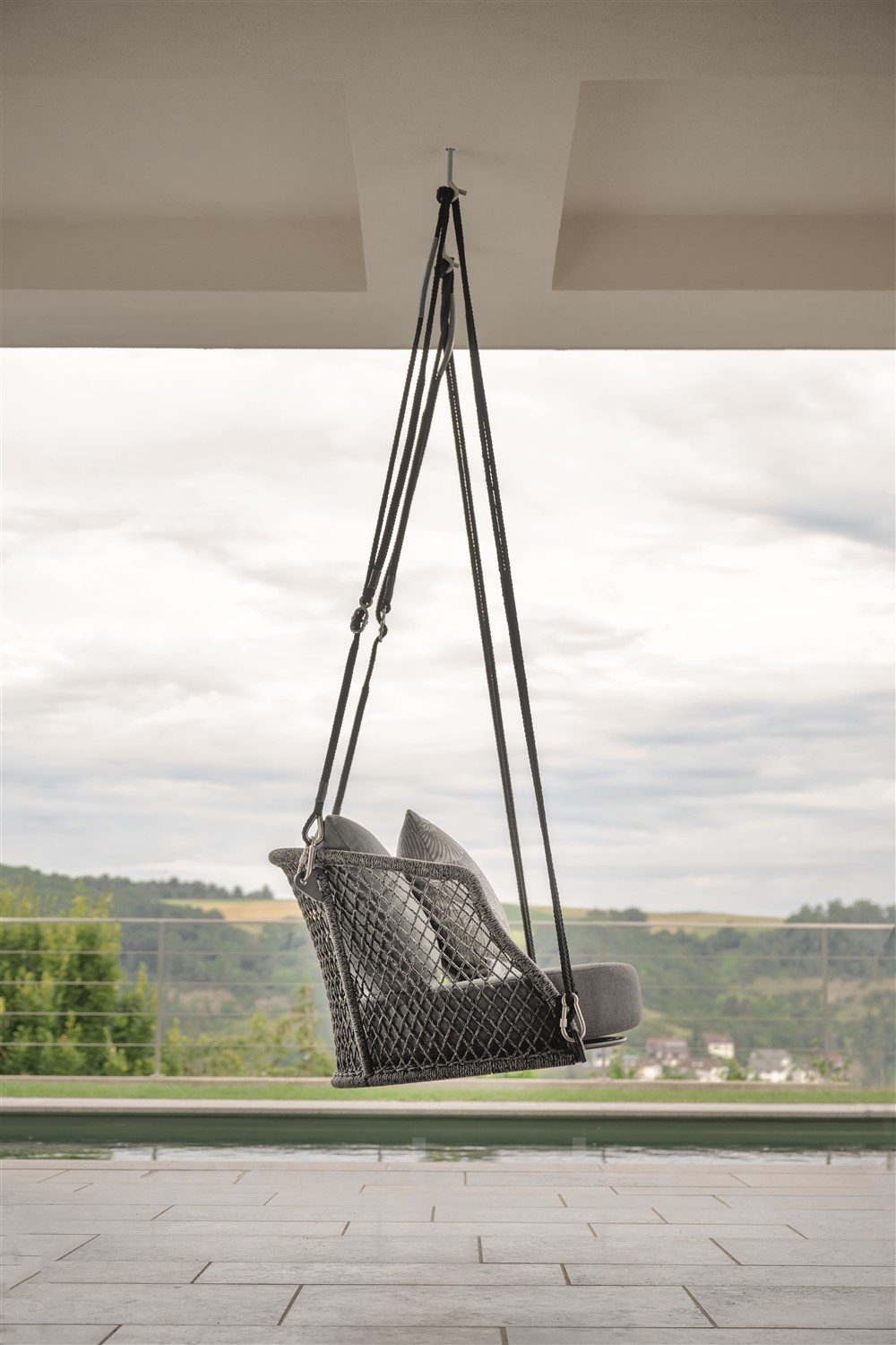 Kolekce venkovních postelí a závěsných houpacích křesel s lankovým výpletem a venkovními sedáky.