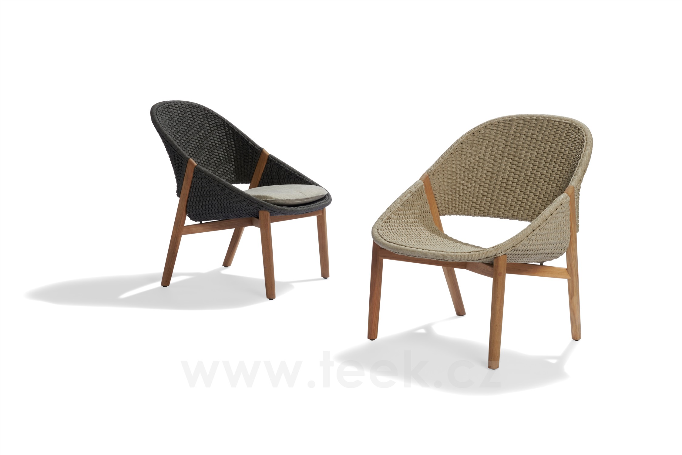 Kolekce designového sedacího venkovní nábytku Elio značky Tribu. Rám je z teakového dřeva, s efektním lankovým výpletem.