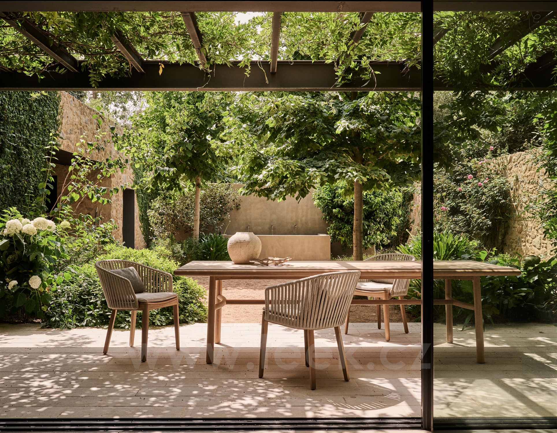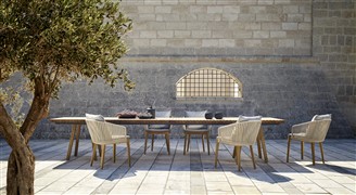 Kolekce jídelního venkovního nábytku Mood značky Tribu. Rám je z teakového dřeva v kombinaci s lankovým výpletem.