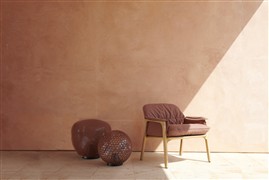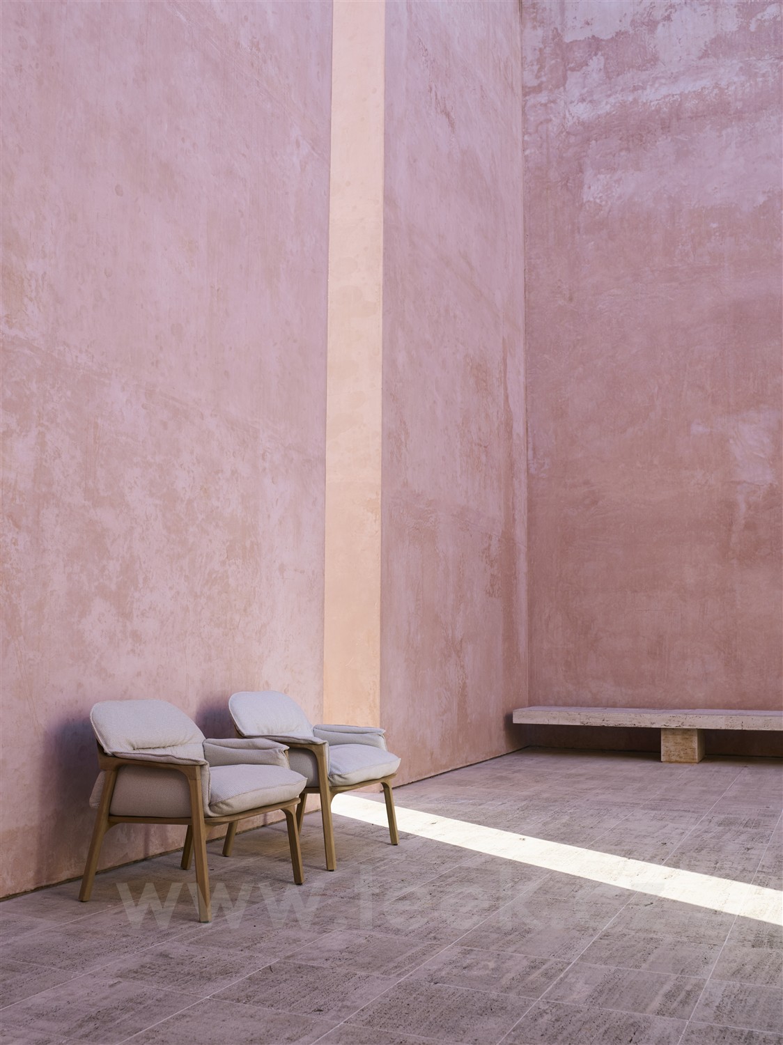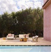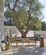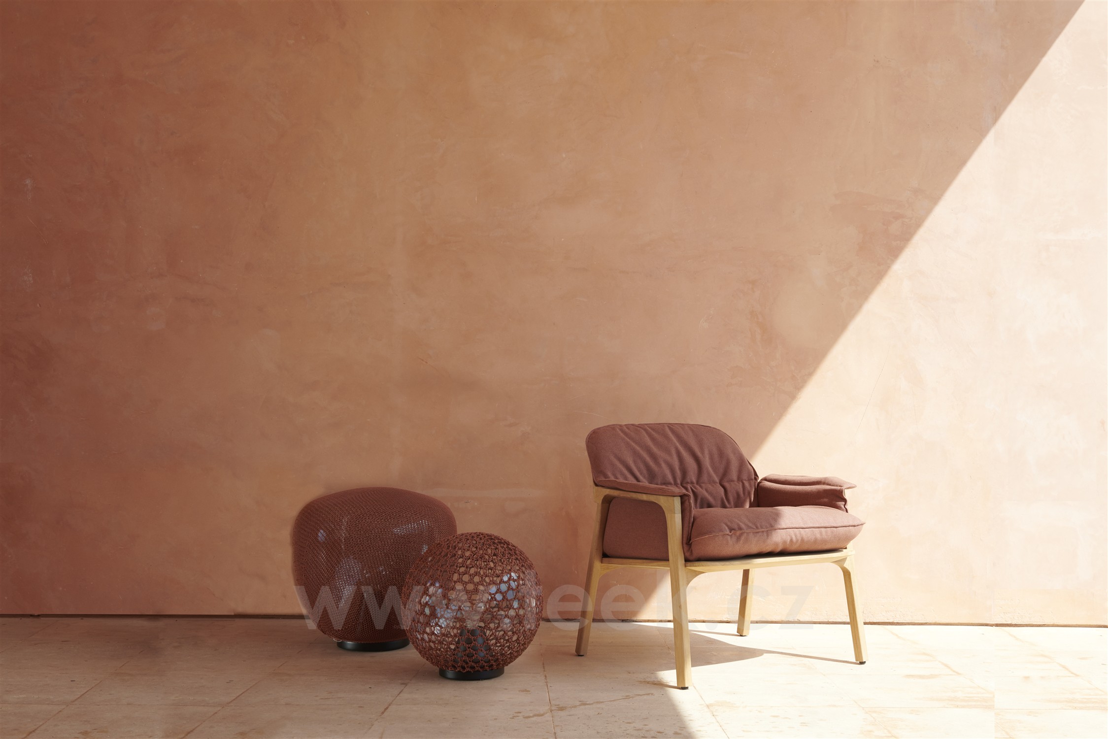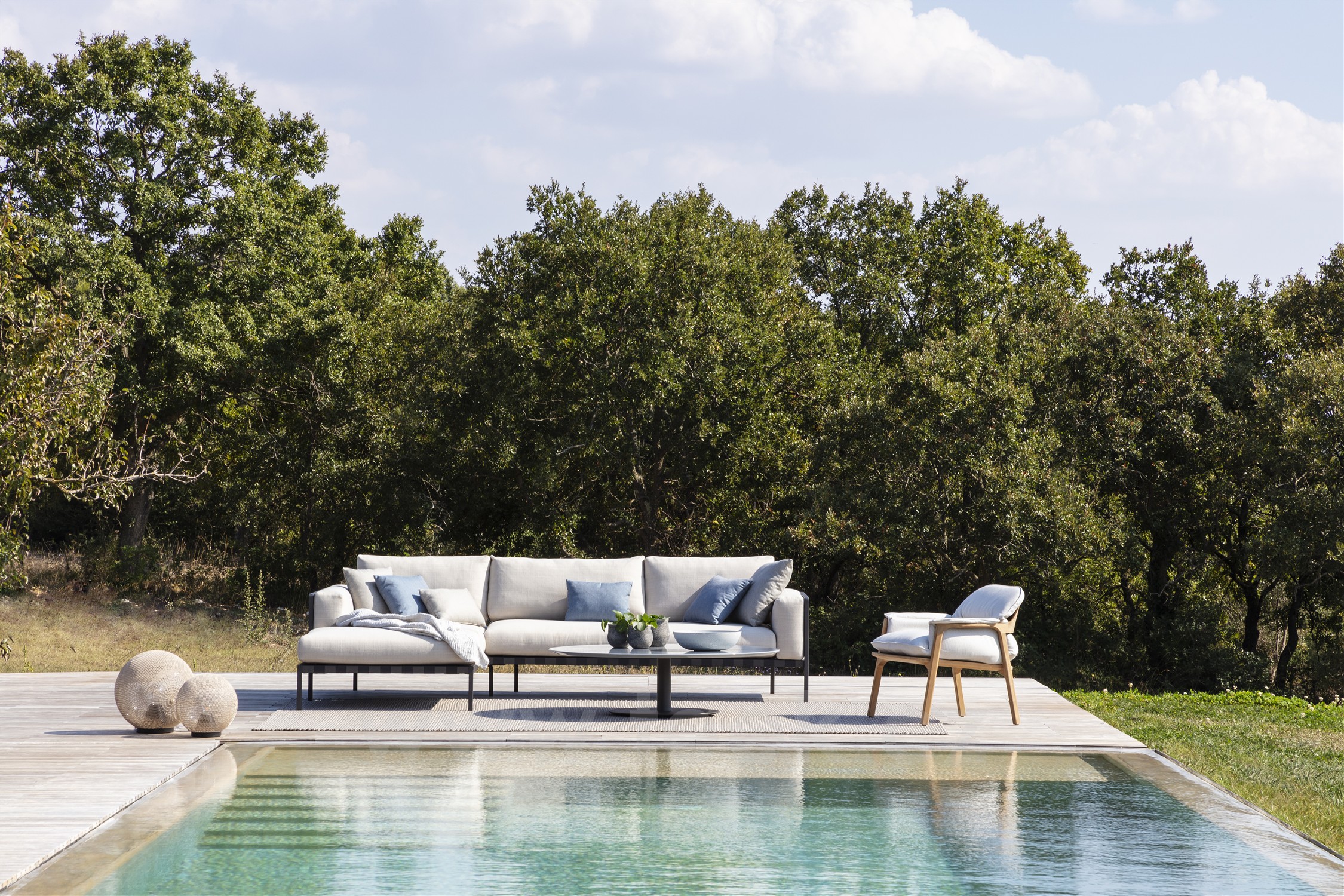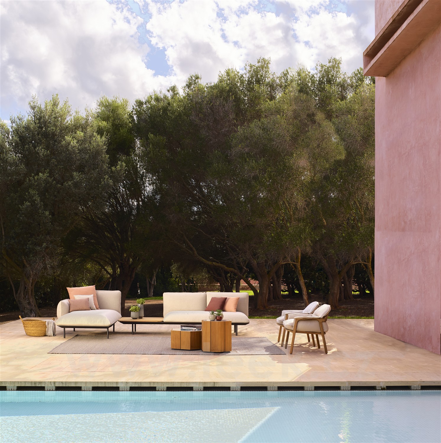 Subtilní a přitom velmi pohodlné nízké venkovní křeslo z teakového dřeva.