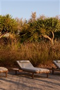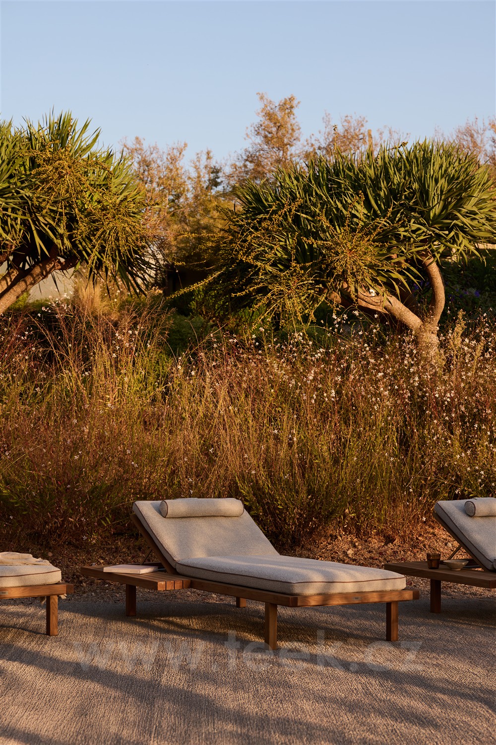 Venkovní polohovací lehátko s odkládacím stolkem Vis a Vis značky Tribu z teakového dřeva.