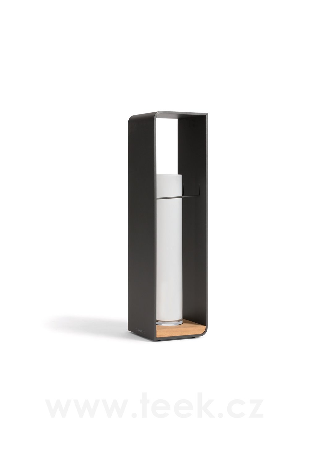 Deska, na které světlo stojí, je z černě mořeného teakového dřeva nebo dřeva Iroko.