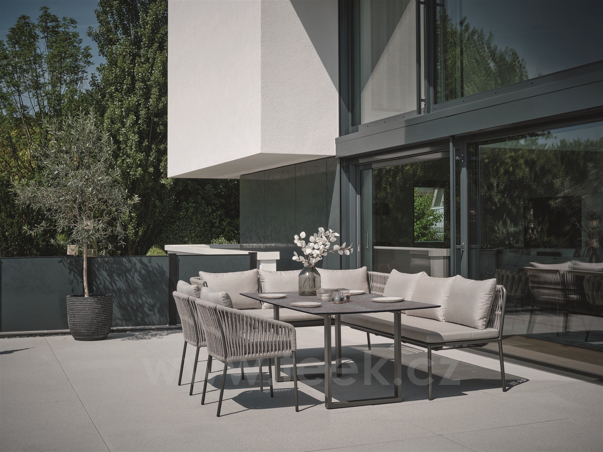 Jídelní zahradní lavice Marla bez područek značky Stern. Je také modulární - lze ji spojit s dalším modulárním dílem ze stejné kolekce pro vytvoření pohodlné rohové jídelní sestavy na terase.