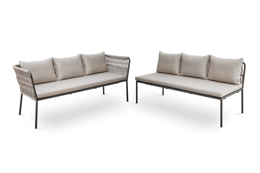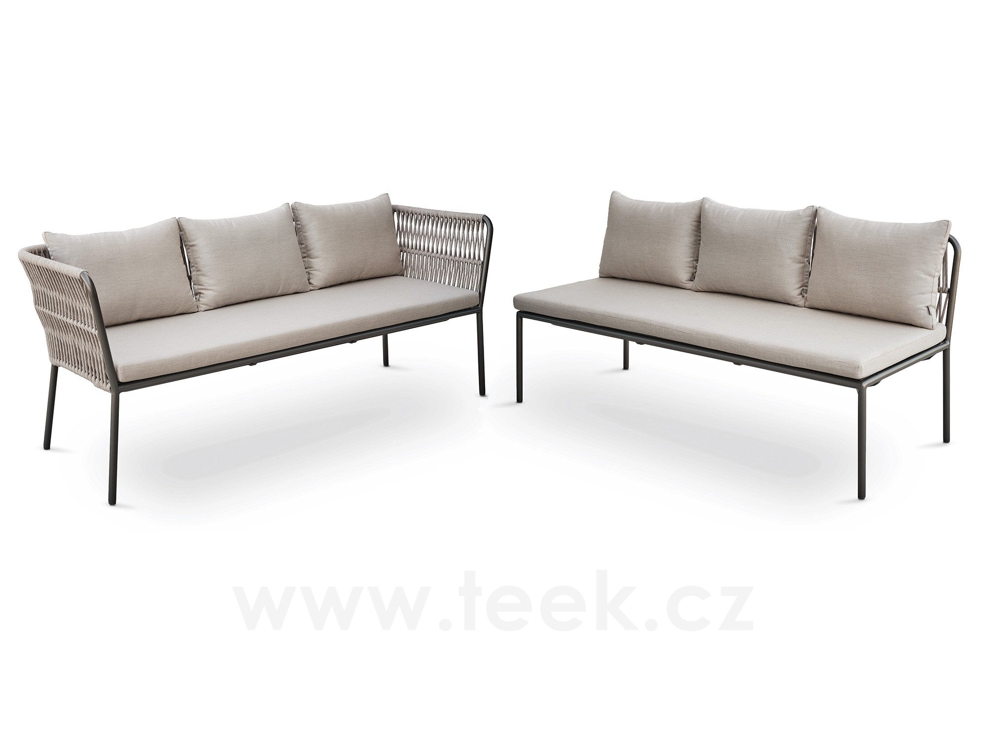 Součástí je i sedák a opěrný polštář z kvalitní venkovní látky. Výplň sedáků je z běžné pěny a proto je potřeba je chránit před velkým deštěm.