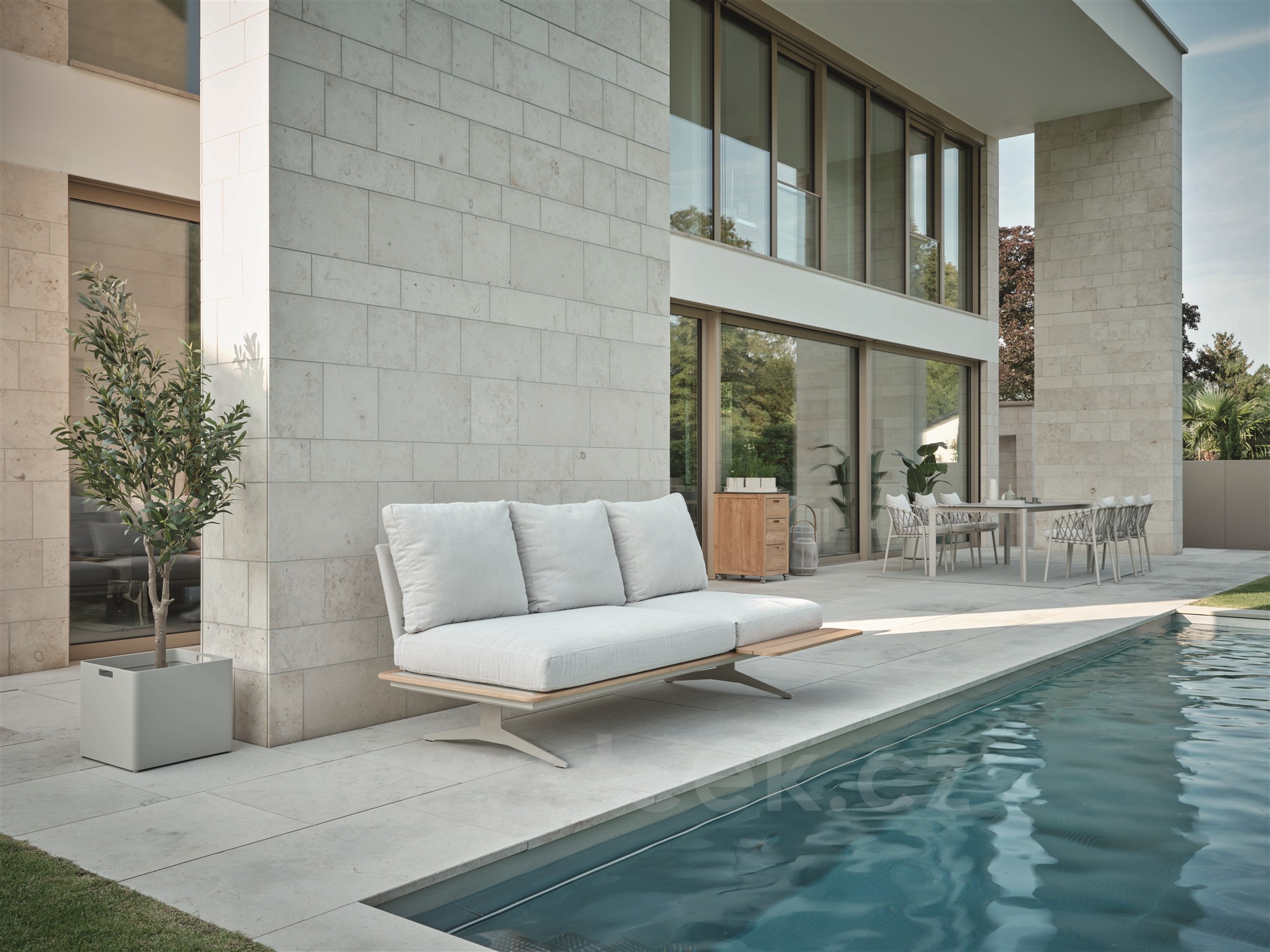 Modulový díl 3-místný polohovací Enya 206x95x85 cm, Stern, rám teak/hliník barva greige, vč. zádových potahovaných opěrek (3ks), sedáky a polštáře (3ks) potah vanilla (100% akryl)