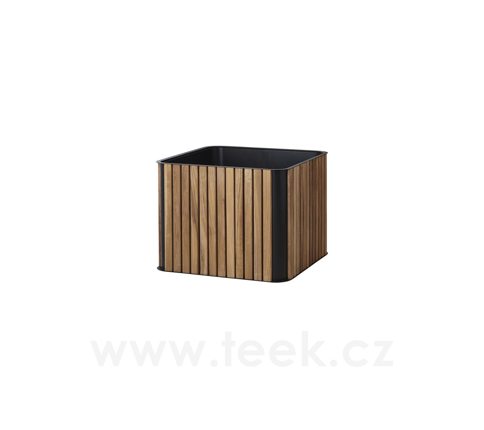 Teakový okrasný květináč kolekce Flowerbox značky Cane-line. Zahradní květináč je vyroben z lakovaného hliníku v kombinaci s teakovým dřevem.