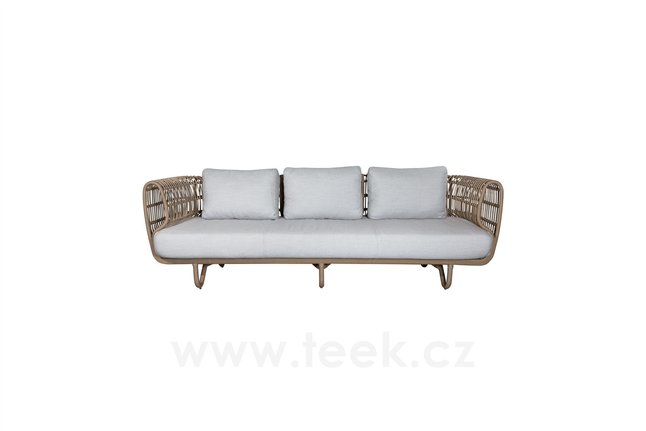 3-místná pohovka Nest, Cane-line, 227x90x74 cm, rám hliník, výplet umělý ratan barva natural, sedáky venkovní látka Airtouch light grey