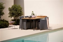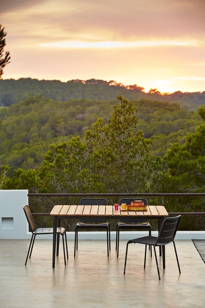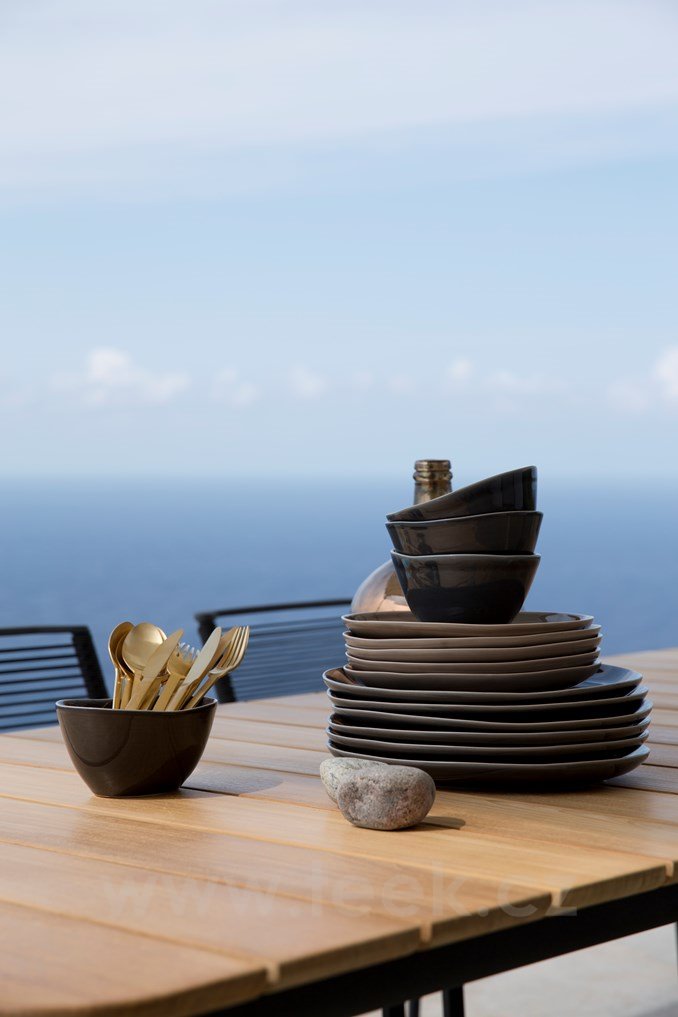 Hliníkový zahradní jídelní stůl kolekce Core značky Cane-line. Rám je z hliníku. Deska stolu je z teakového dřeva.