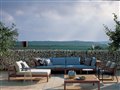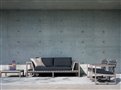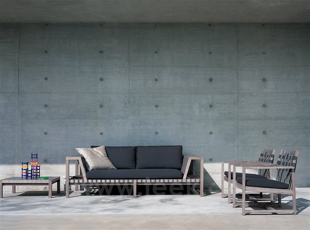 Teakový konferenční stolek Network značky Roda. Konstrukce konferenčního stolku je teaková, deska stolku kámen - Luna (pískovec, šedo-světle modrý) nebo Farsena (pískovec/vápenec, šedo-hnědý) nebo HPL.