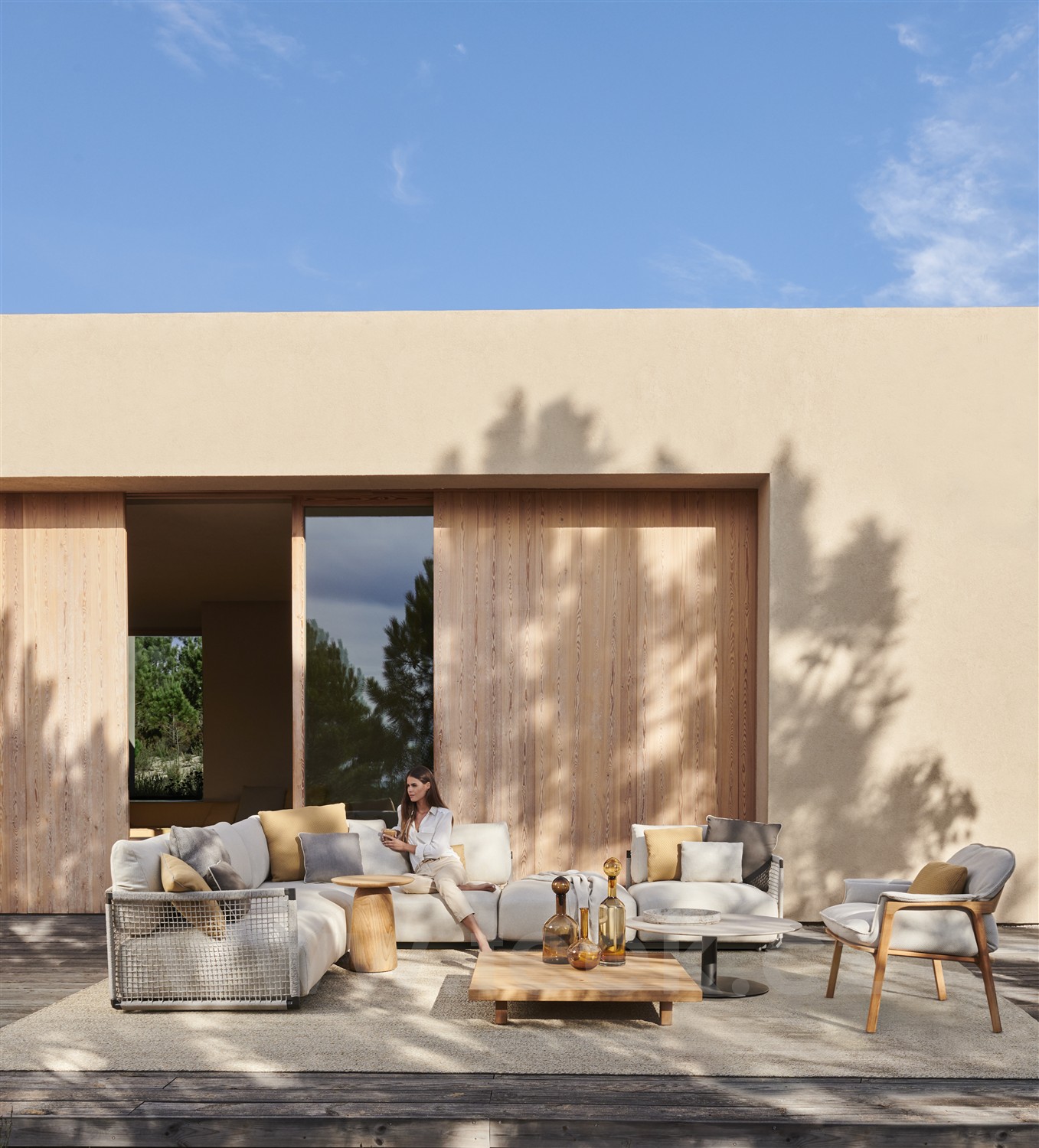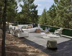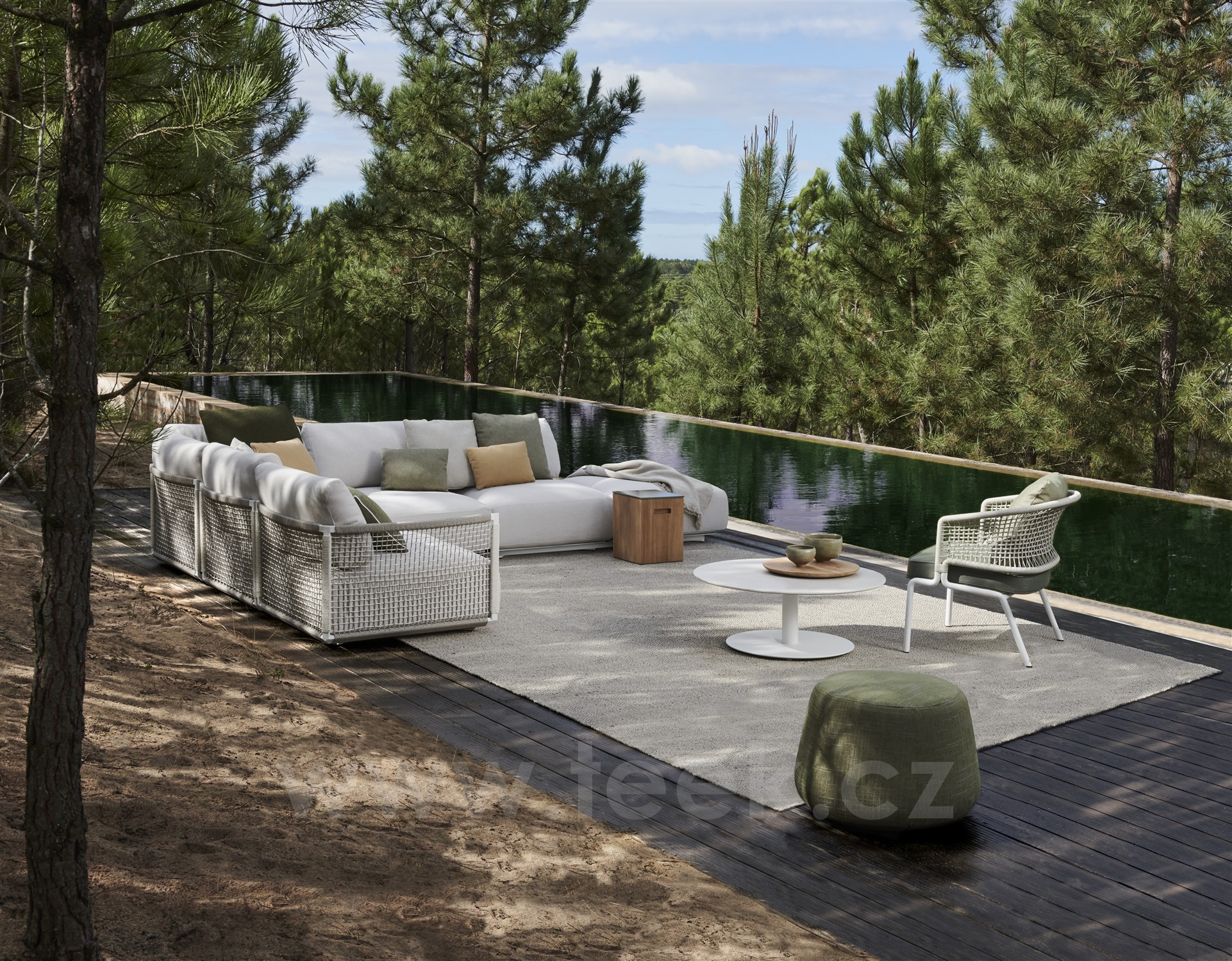 Konferenční venkovní stolek T-Table značky Tribu s rámem z lakované nerezové oceli a s deskou stolu z keramiky nebo glazovaného lávového kamene.