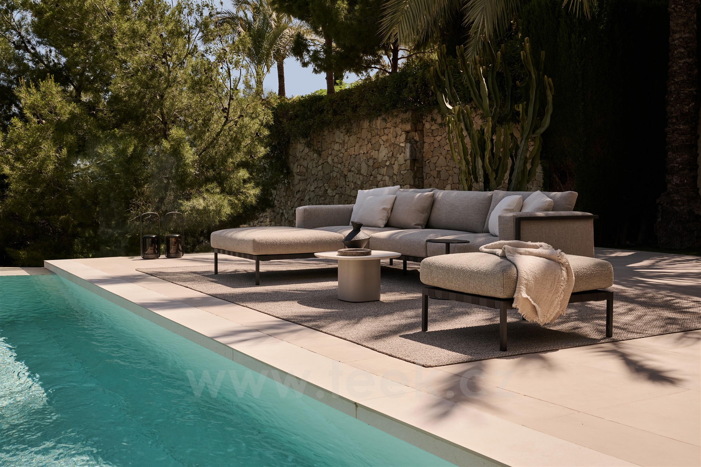Odkládací stolek Seren, Tribu, čtvercový 58x58x39 cm, rám hliník barva linen, deska keramika dekor sabbia