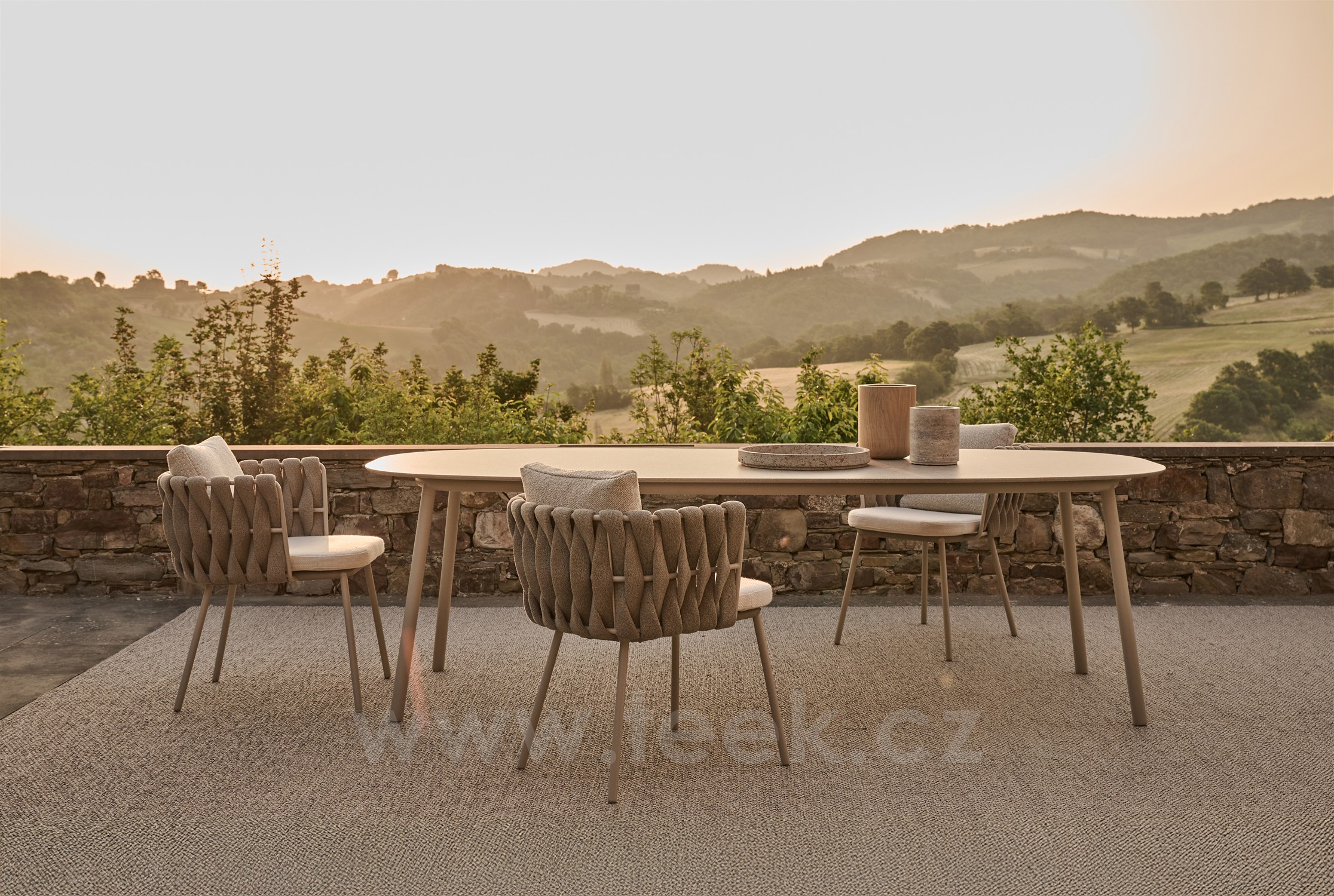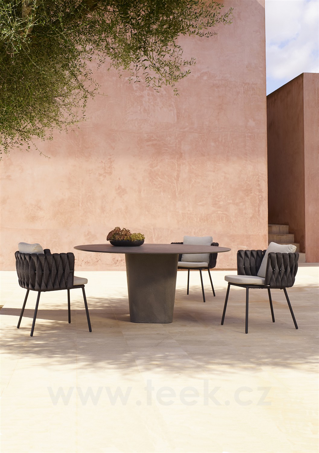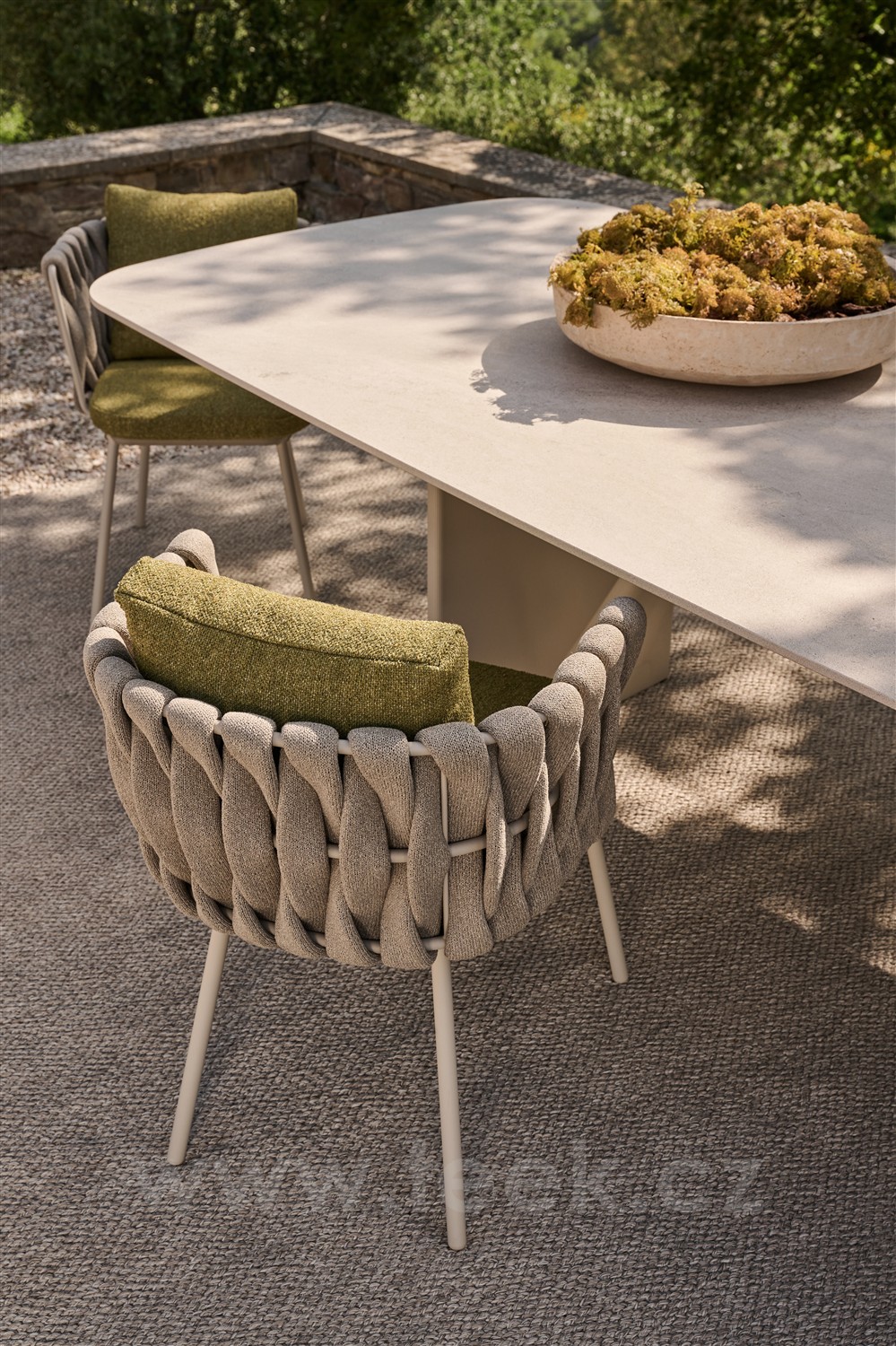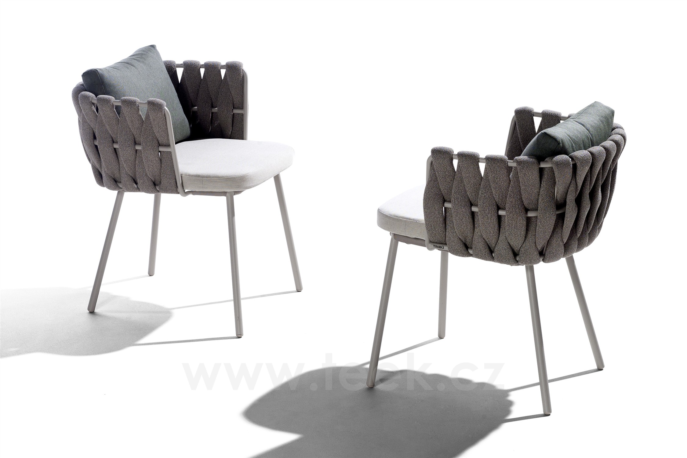 Ikonické jídelní venkovní křeslo Tosca značky Tribu s rámem z lakované nerezové oceli, výplet vizuálně atraktivní plný výplet ve špičkové venkovní kvalitě.