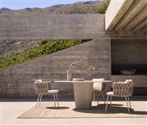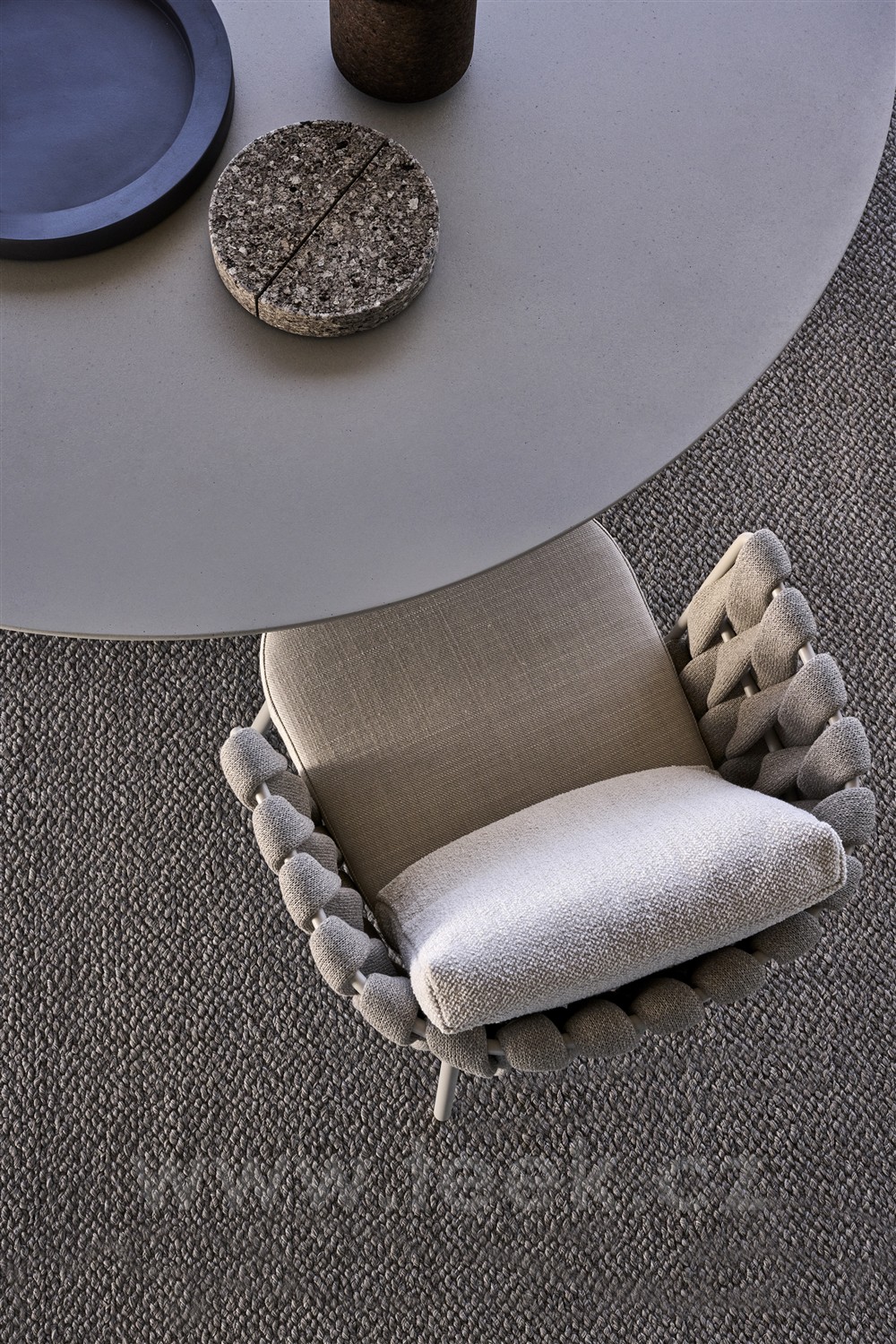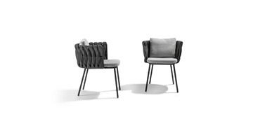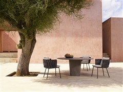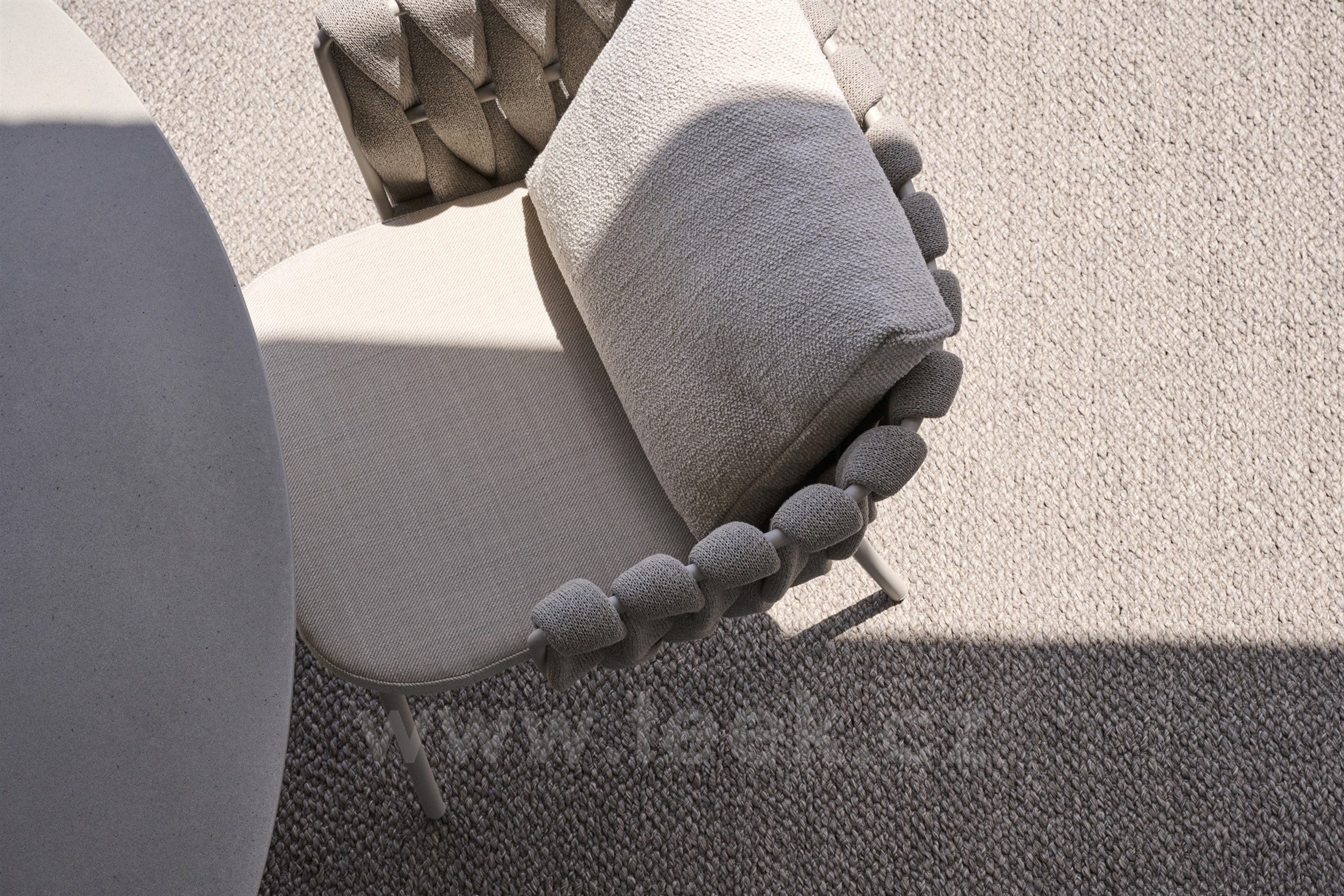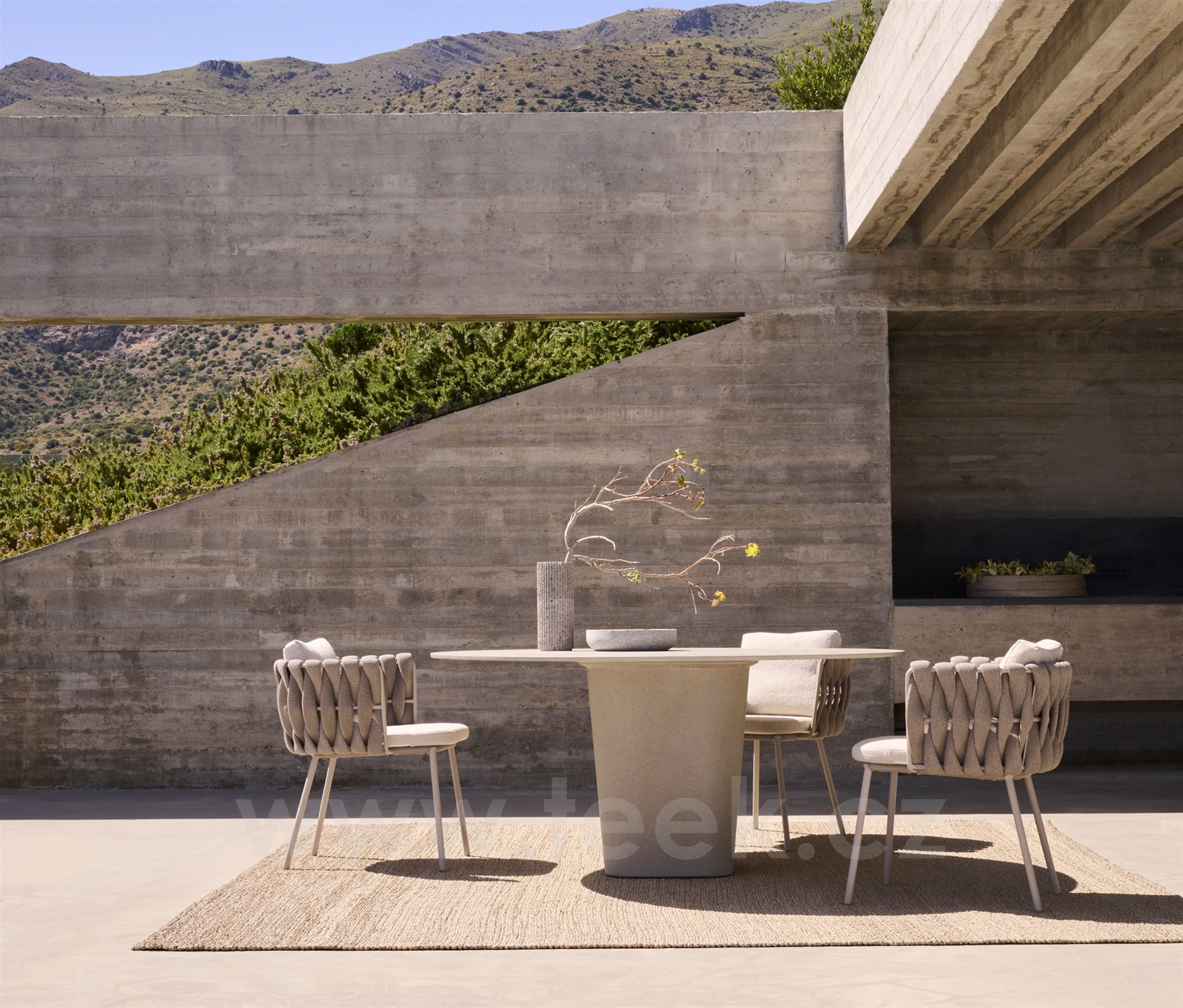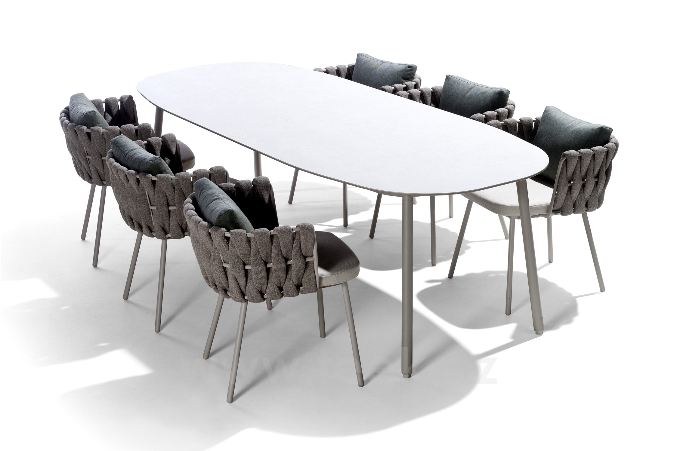 Ikonické jídelní venkovní křeslo Tosca značky Tribu s rámem z lakované nerezové oceli, výplet vizuálně atraktivní plný výplet ve špičkové venkovní kvalitě.